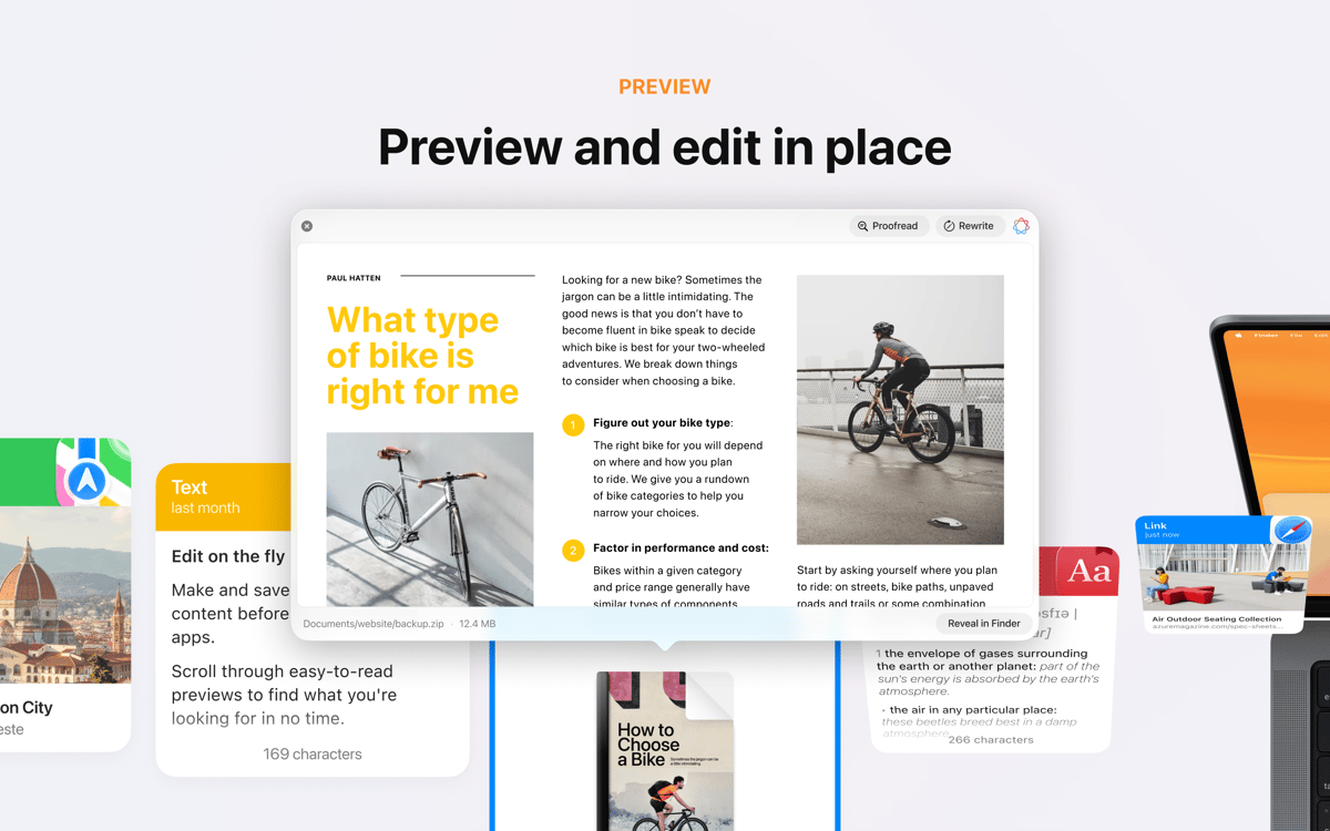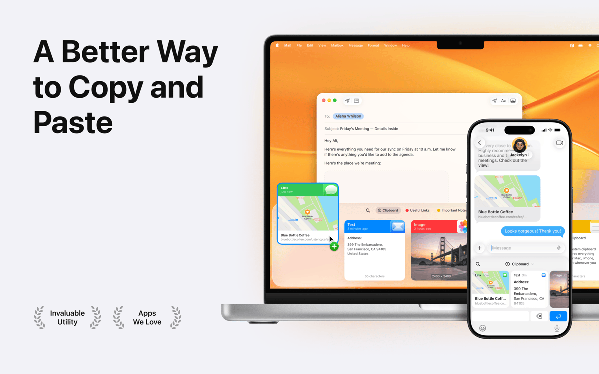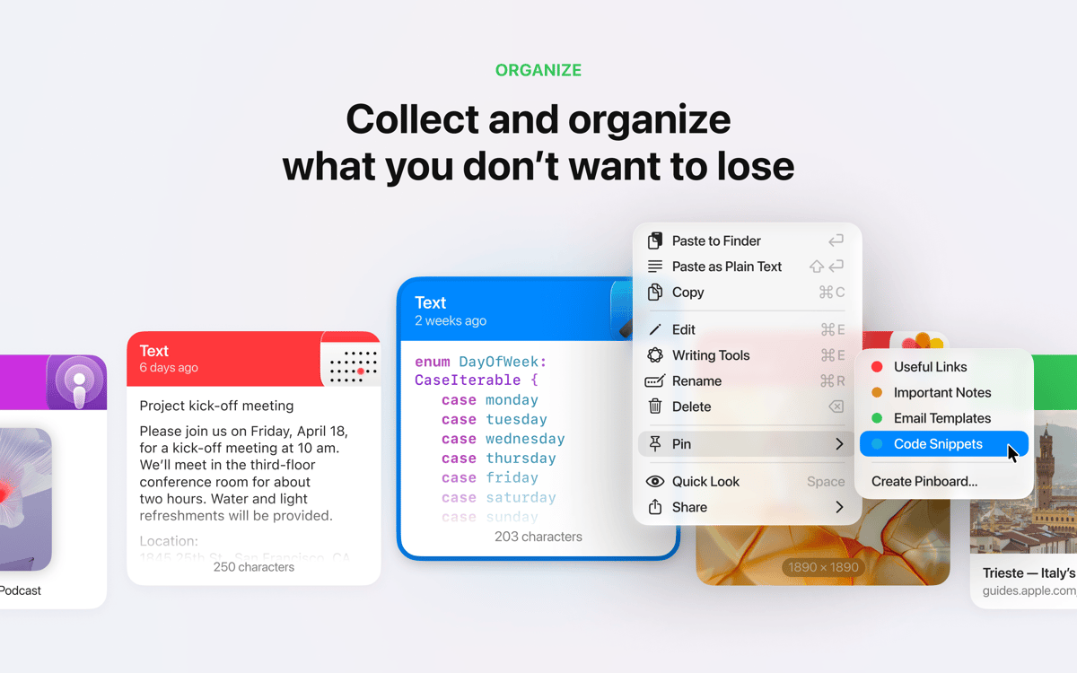 Wie wäre es mit einer erheblichen Steigerung deines alltäglichen Copy-Paste-Workflows? Verwende Paste, wenn du gleichzeitig mehrere Elemente kopieren und innerhalb von Sekunden auf Dinge zurückgreifen möchtest, die du zuvor kopiert hast. Fragst du dich, wie das geht? Es ist alles ziemlich einfach. Dieser leistungsstarke Manager für den Zwischenablagenverlauf behält alles, was du kopierst ungeachtet des Formats – Text, Fotos, Bildschirmfotos, Links usw. So kannst du schnell alles jederzeit aufrufen, wenn du es brauchst. Man kann also ohne Übertreibung sagen, dass die App die Kapazitätsbegrenzung deiner Mac-Zwischenablage aufhebt. Darüber hinaus kannst du mit dieser tollen App nun die wichtigsten Verlaufselemente an einem Ort in gut strukturierter Weise und über alle Geräte hinweg speichern.