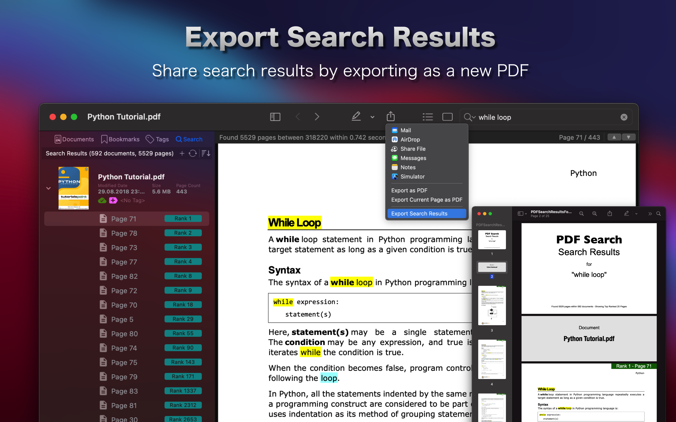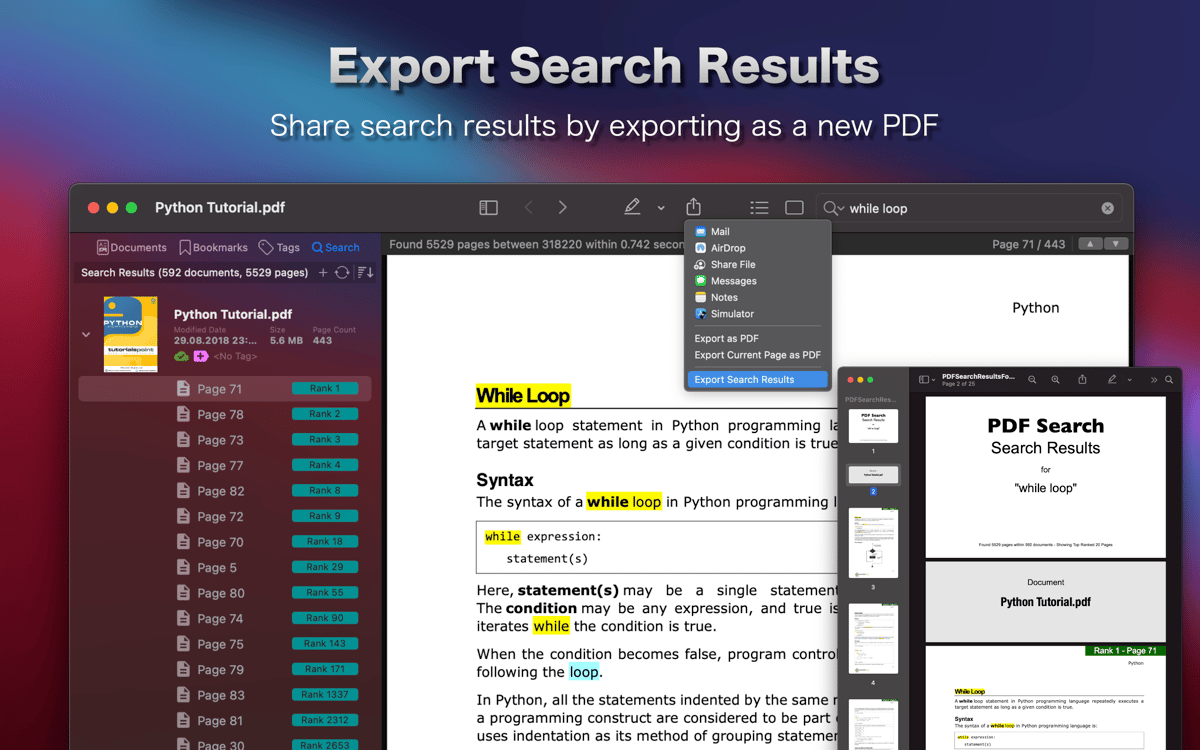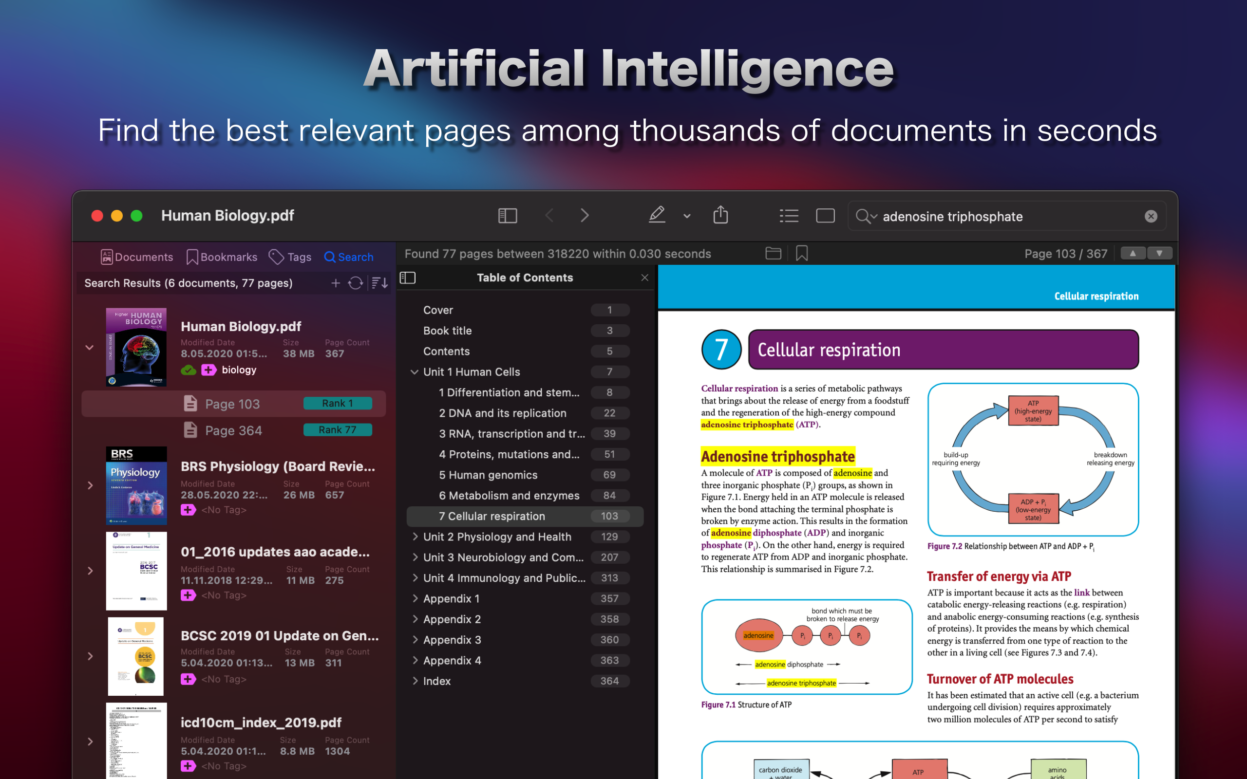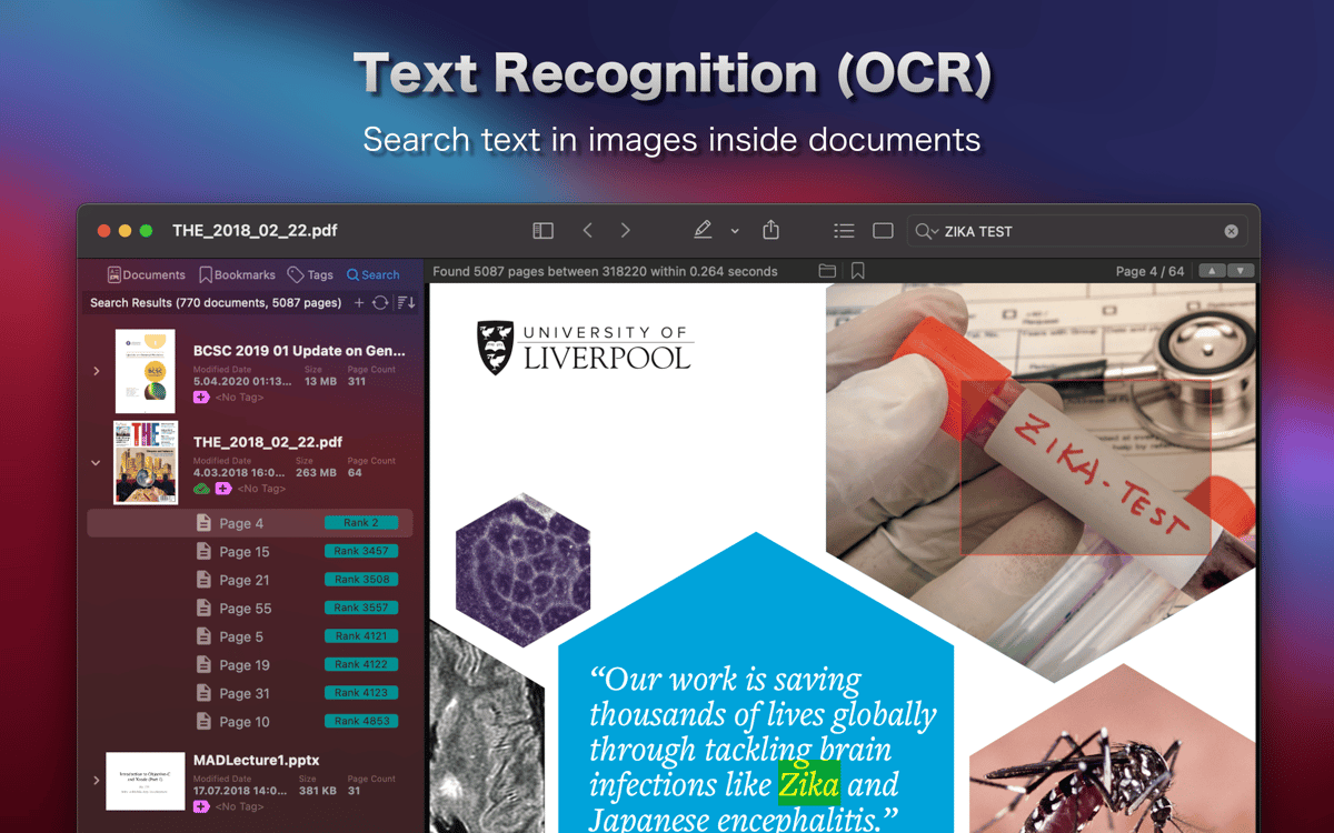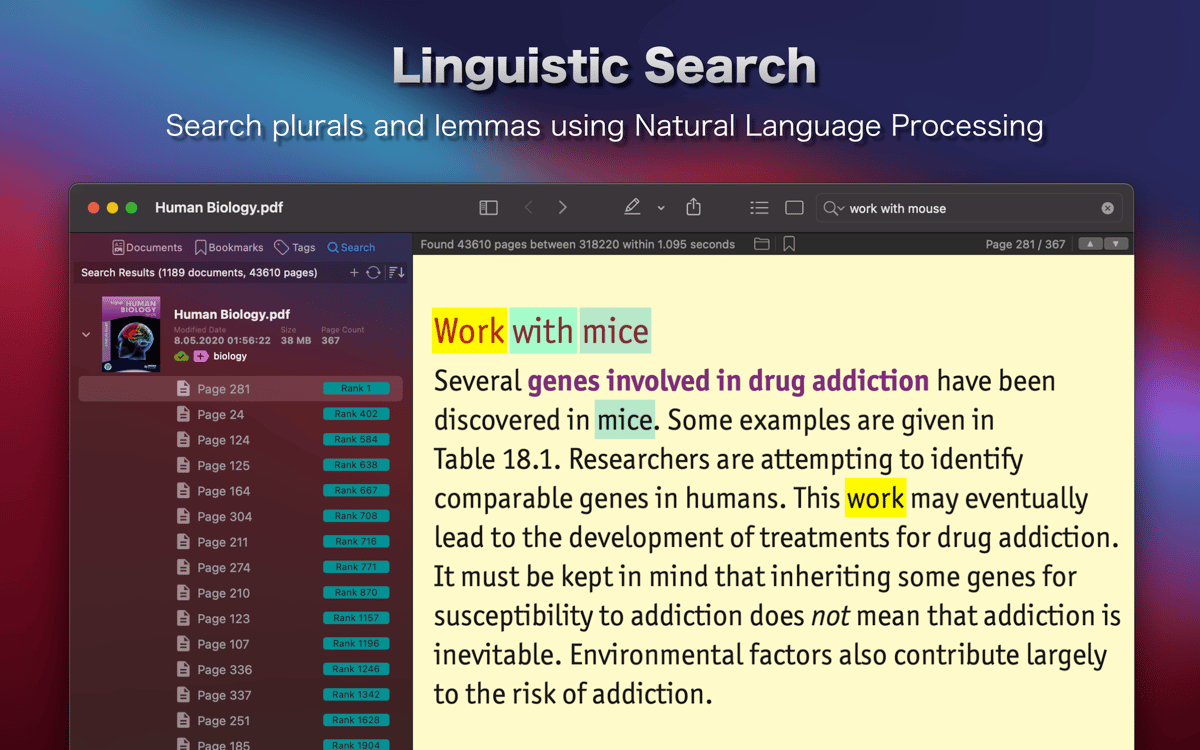 Wenn du versuchst, bestimmte Fakten oder Zahlen zu finden, können PDFs, gerade auch wenn sie hunderte von Seiten umfassen, Schwierigkeiten bereiten. Standard-Apps wie Vorschau bieten nur begrenzte Möglichkeiten, wodurch die Textsuche eine Herausforderung wird. Aber genau dann hilft PDF Search. Anders als andere Apps, die nur Inhalte abgleichen, kann dieses leistungsstarke Hilfsprogramm eine ausgeklügelte Suche nach Relevanz auf deine Dokumente loslassen. PDF Search findet nicht nur Entsprechungen für deine Suchbegriffe, es prüft verwandte Begriffe sowie mehrfache Begriffskombinationen und liefert Ergebnisse in einem Format, das du tatsächlich verstehst.