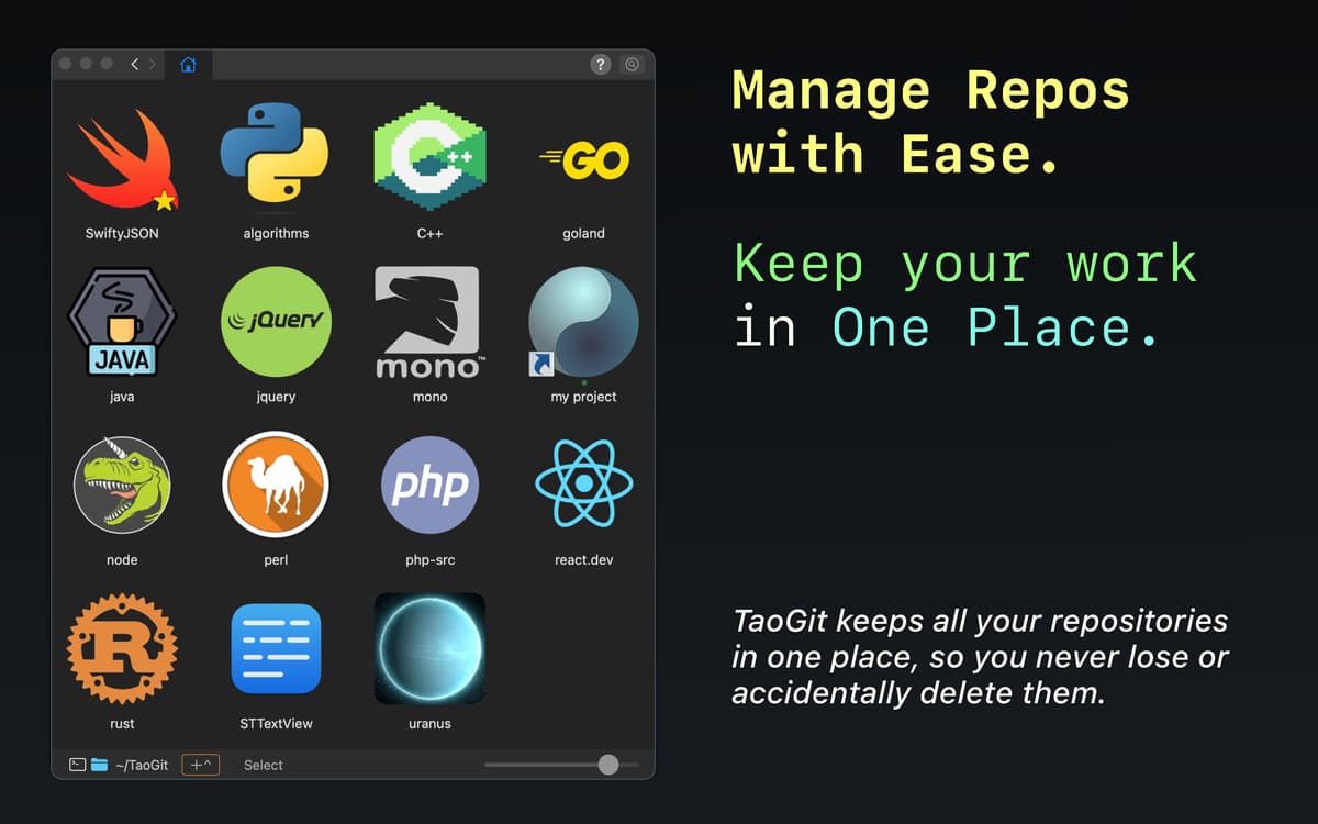 Nutze den Browser von TaoGit, um blitzschnell durch deine Projekte zu navigieren. Füge Favoriten hinzu, bewege deine Repositories per Drag & Drop, um sofortige Direktlinks zu erstellen, und öffne Projekte in Terminal, Finder oder XCode. Hast du eine URL in deiner Zwischenablage? Klone das Repository mit einem einzigen Klick!