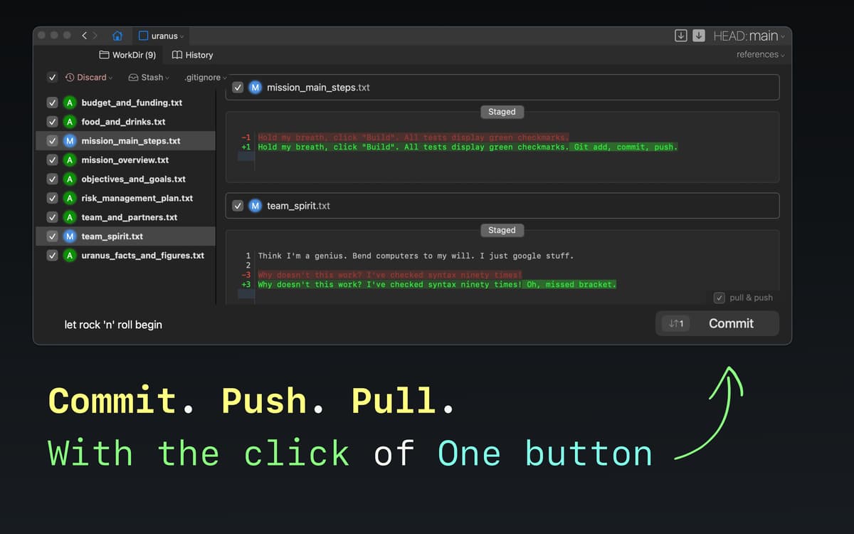 Genieße eine völlig neue Erfahrung mit den Aktionen in Git: Commit, Pull und Push mit einem einzigen Klick. Führe sofort eine vollständige Synchronisierung durch, um alle Änderungen zu übernehmen, oder verwende sie nach Bedarf einzeln. Die Benutzeroberfläche von TaoGit ähnelt dem Design von macOS und erleichert dir die Navigation in deinen Projekten.