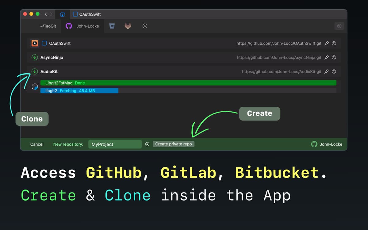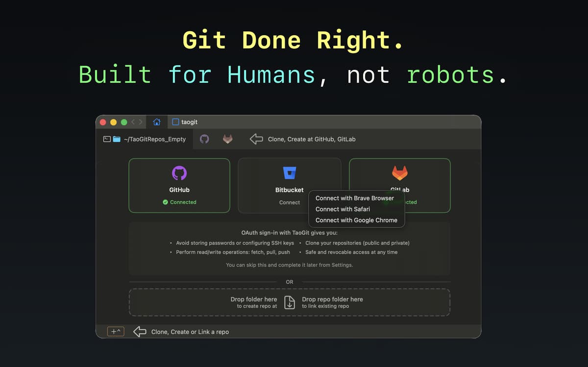 TaoGit soll dein Git-Erlebnis so einfach wie möglich gestalten. Die Oberfläche der App hat ein vertrautes macOS-ähnliches Design und ihre Funktionen vereinfachen einige der häufigsten Git-Benutzererfahrungen. Durch die App wird dein Git-Erlebnis unkompliziert, schnell und intuitiv.