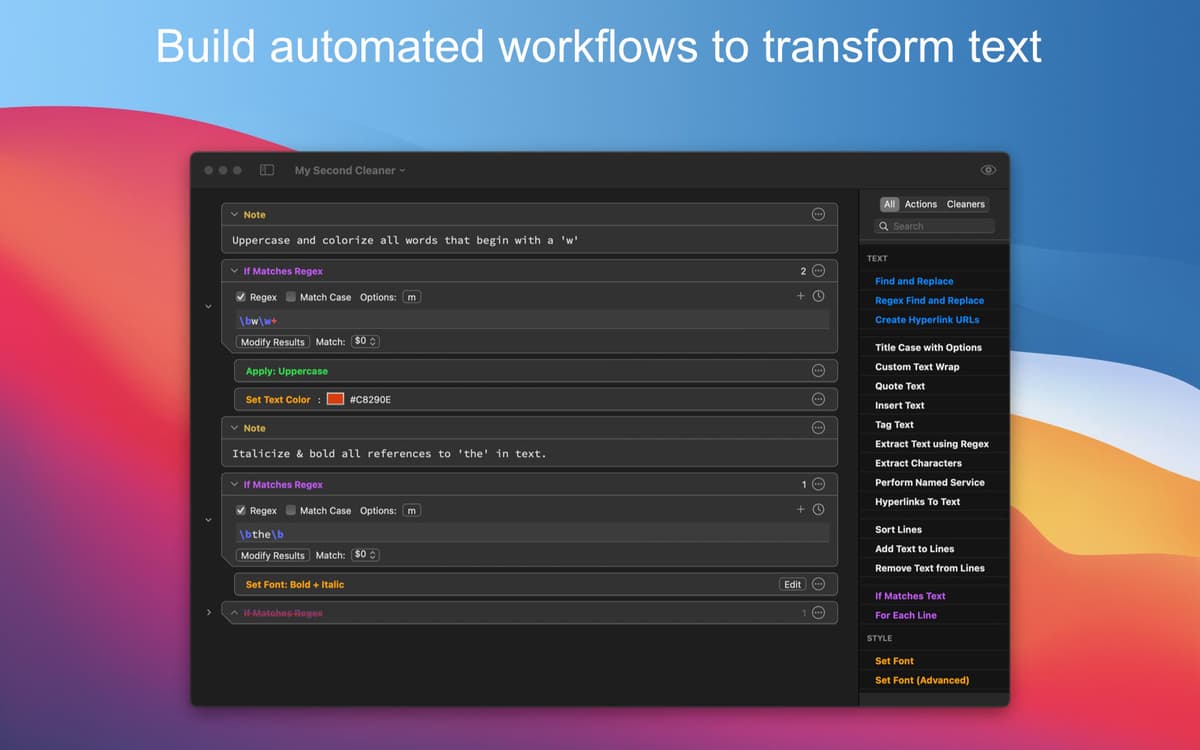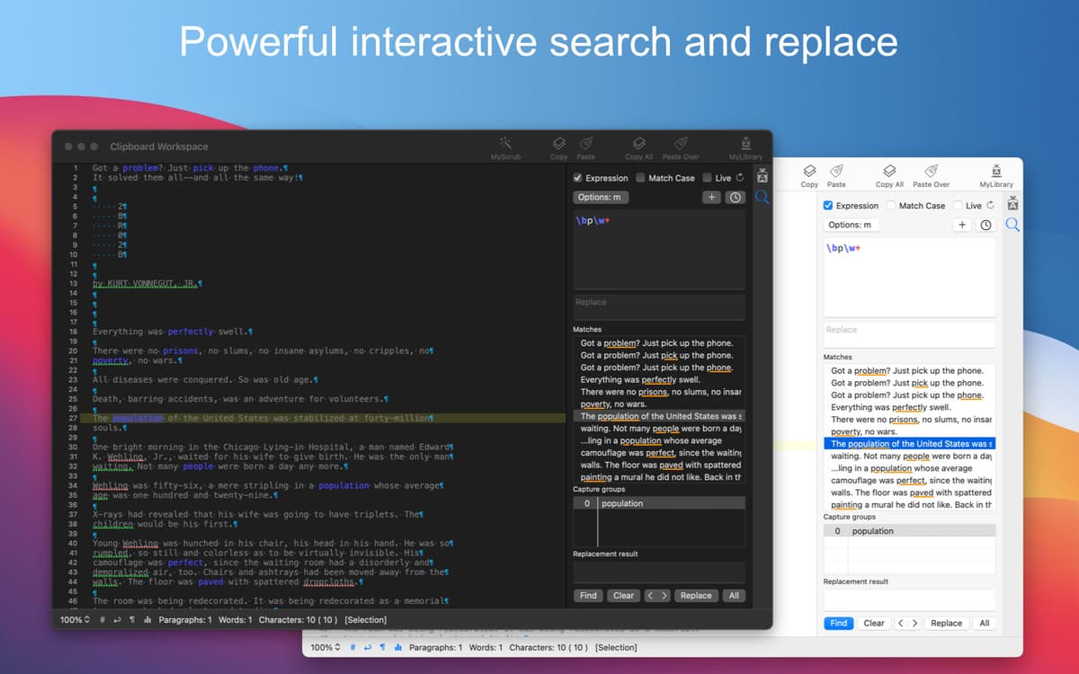Das reduzierte Design der App-Oberfläche ist dazu gedacht, nicht zu stören. Mit farblich kodierter Syntax und einem minimalistischen Layout kannst du dich auf den Text und die gewünschten Ausdrücke konzentrieren. Es sieht nicht nur besser aus, sondern lässt dich auch verstehen, welche Auswirkung das Skript auf den Text hat, den du bearbeitest.
