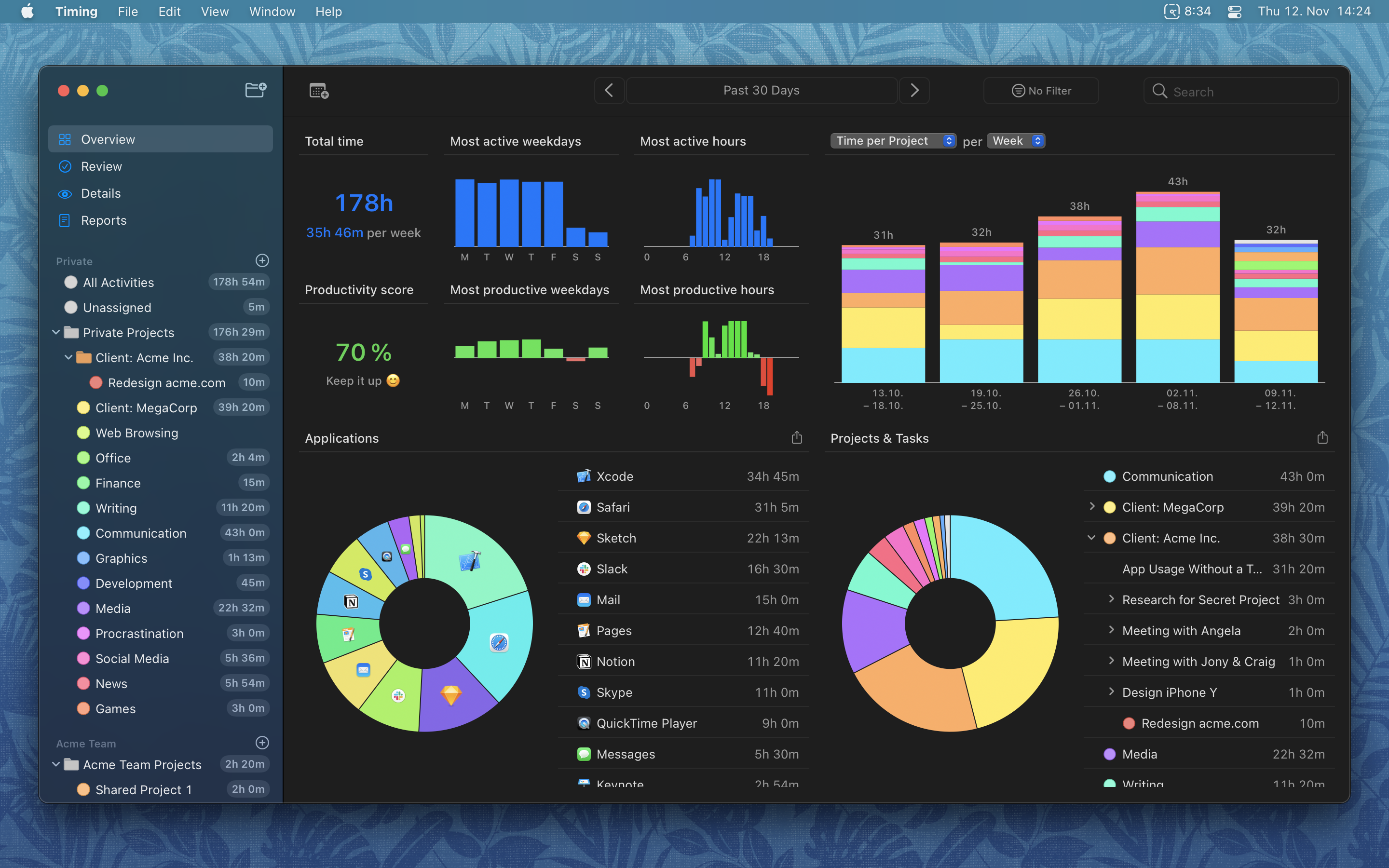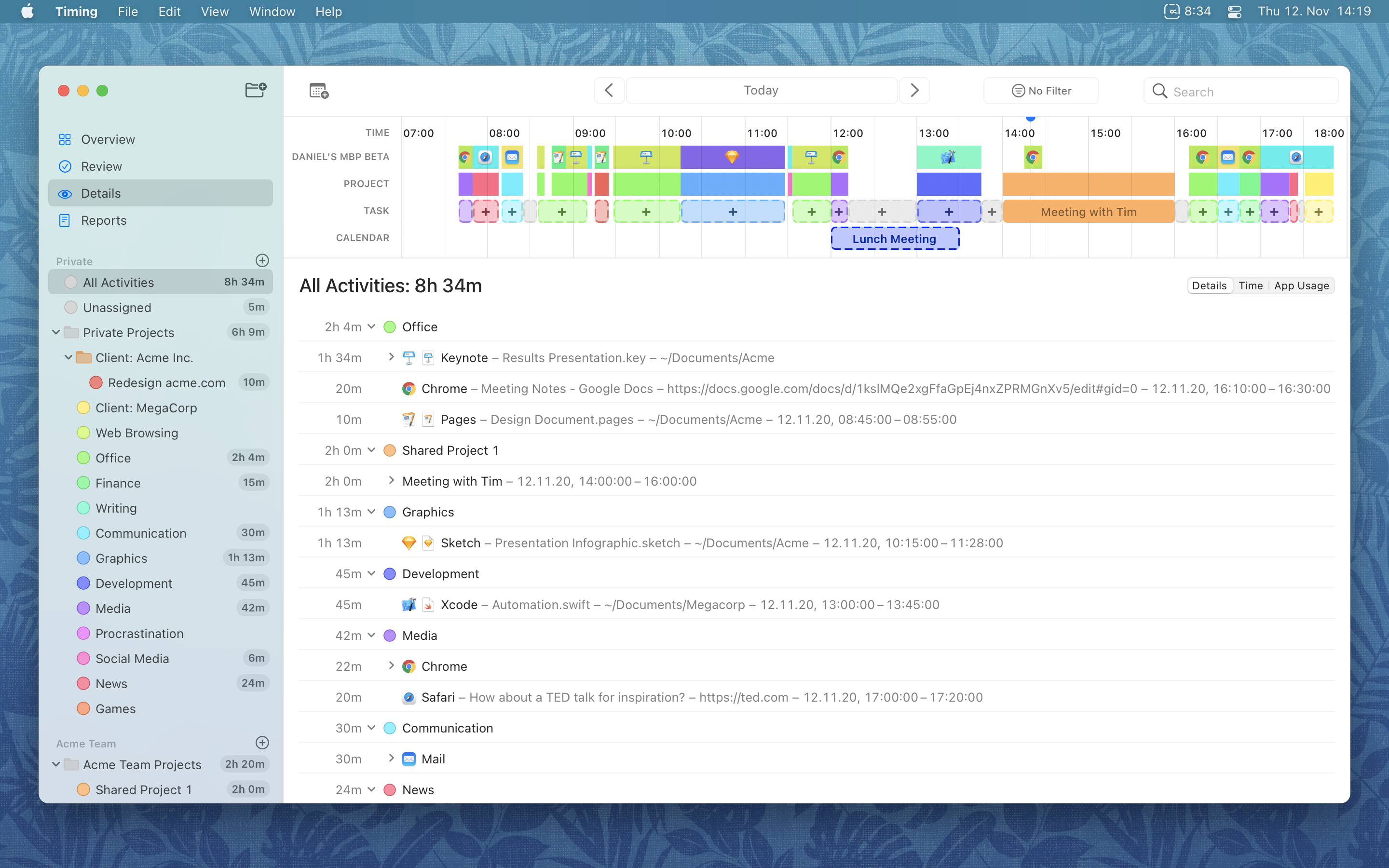 In der heutigen, sich ständig verändernden Umgebung musst du wissen, wo deine Zeit geblieben ist. Timing ist ein großartiges Tool zur automatischen Zeiterfassung. Es zeichnet auf magische Weise auf, wie viel Zeit du mit jeder App, jedem Dokument und jeder Website verbringst – unabhängig davon, ob du von zu Hause oder im Büro arbeitest. Die Zeitleiste zeigt sogar an, wann du woran gearbeitet hast. So kannst du mit einem Klick deine Arbeitsstunden erfassen.