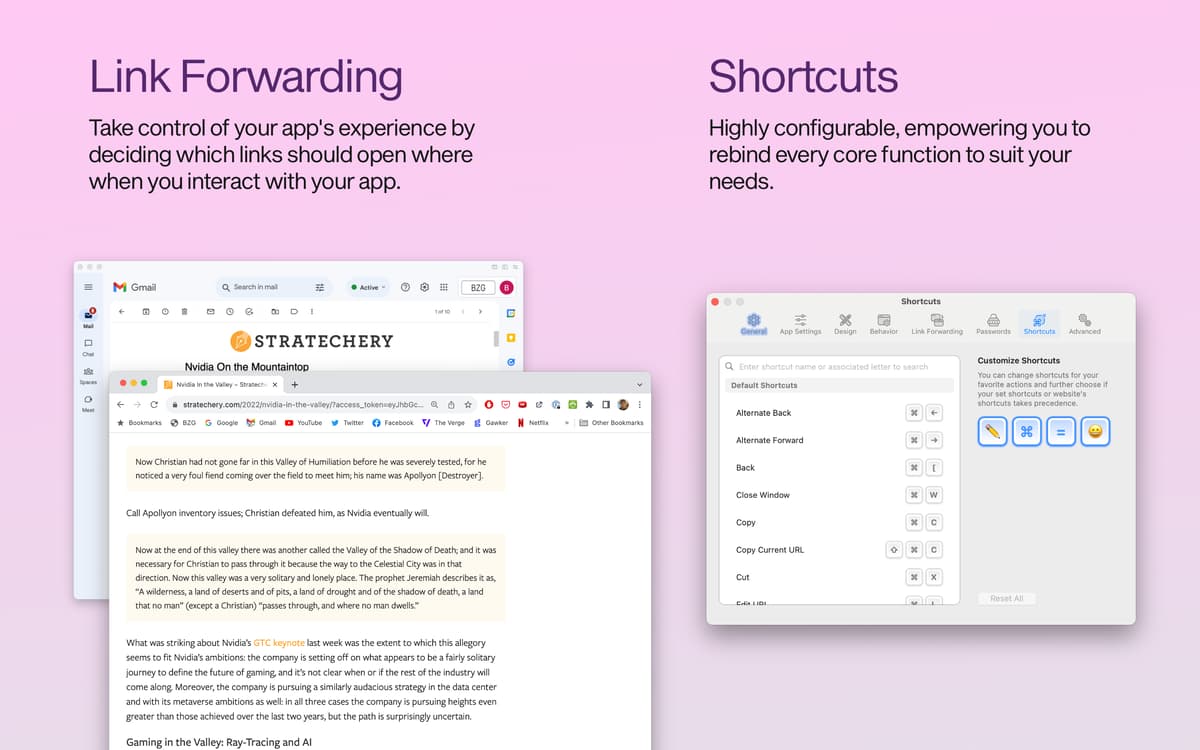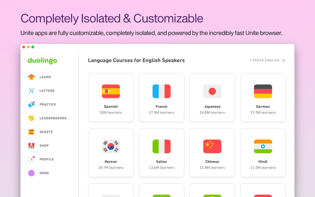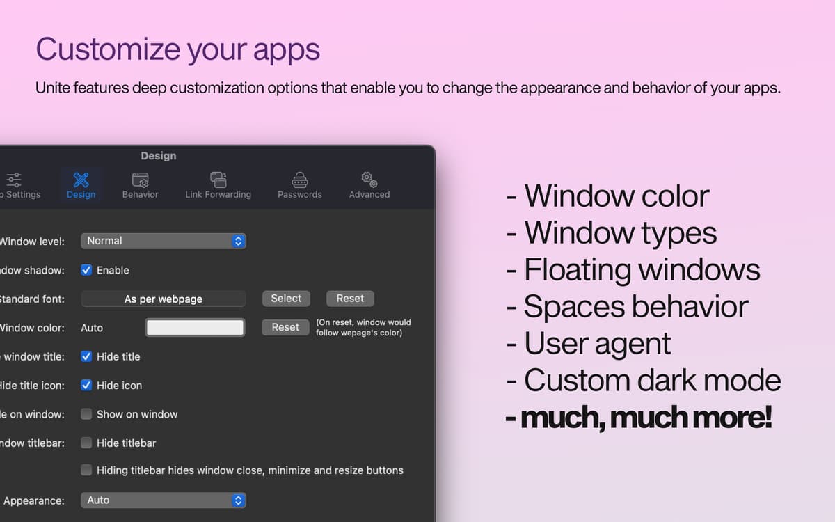 Nutze das intelligente Erstellungs-Tool von Unite und verwandle Websites ganz einfach in Apps. Passe deine App flexibel an, vom Layout bis zum In-App-Design. Durch einen leistungsstarken Backend-Browser, Keychain-Unterstützung, Benachrichtigungen, schwebende Fenster und mehr, erstellt Unite Apps, die sich nativ auf dem Mac anfühlen.