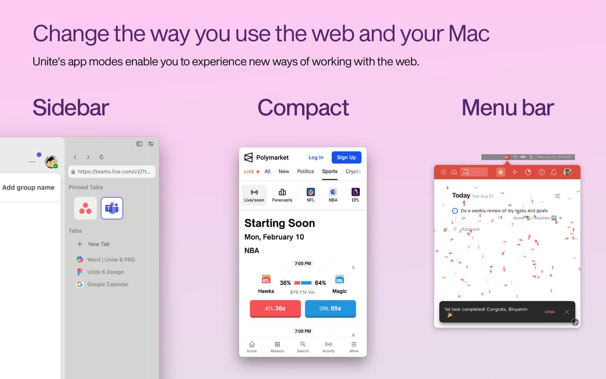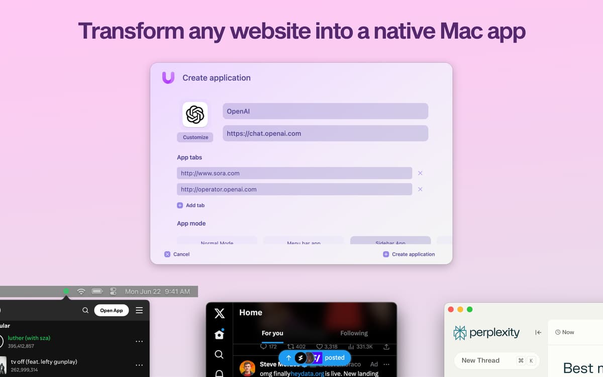 Unite ermöglicht es dir, jedes mobile Erlebnis auf den Mac zu bringen. Verwandle deinen Instagram-Feed in ein praktisches macOS-Fenster oder erstelle eine beliebige kompakte App, mit der du vom Desktop aus auf mobile Inhalte zugreifen kannst.