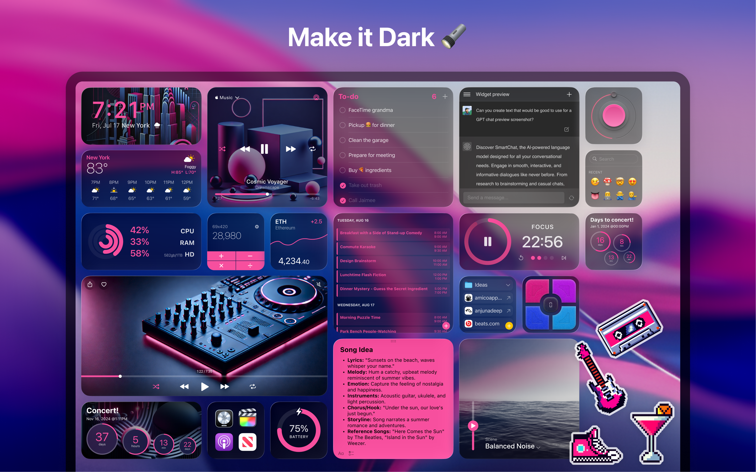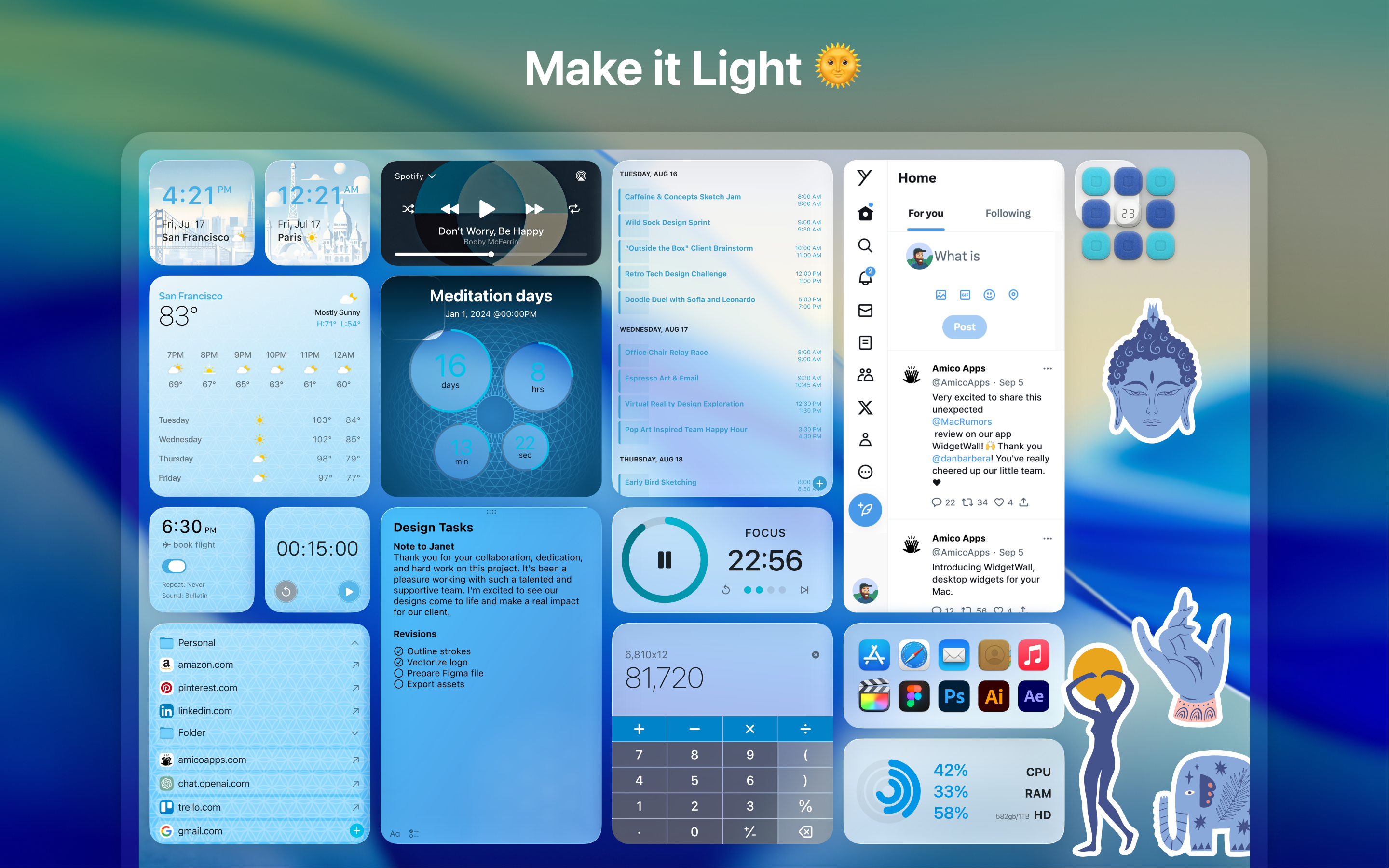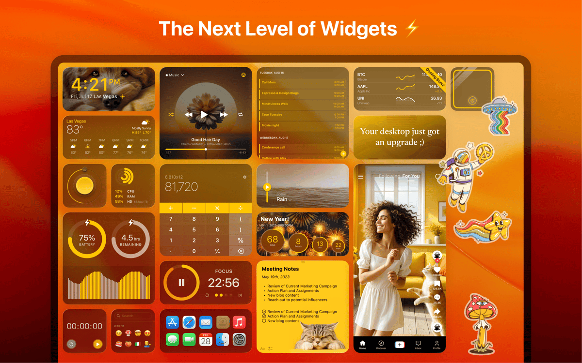 Nutze WidgetWall, um deine meistgenutzten Tools auf dem Schreibtisch zu platzieren und schnell auf deine Mac-Apps zuzugreifen. Füge Uhren- und Wetter-Widgets, Mac-Statistiken und vieles mehr hinzu.