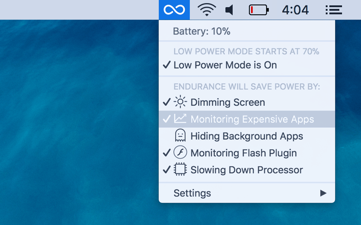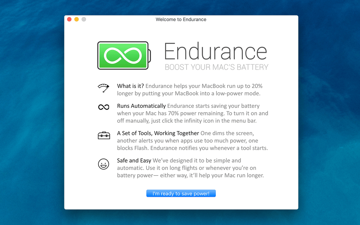 ¿No has querido alguna vez sacarle un poco más de partido a la autonomía de tu MacBook? Ahora tienes Endurance, la app diseñada para hacer que la batería de tu portátil dure más mientras cuida de su salud en general. Con tan solo unos ajustes de ahorro de energía, puede alargar la autonomía en hasta un 20% para que puedas hacer más entre una carga y otra. Y lo que es más, piensa en todo lo que podrías hacer con el tiempo gastado en buscar enchufes. Veamos cómo funciona: