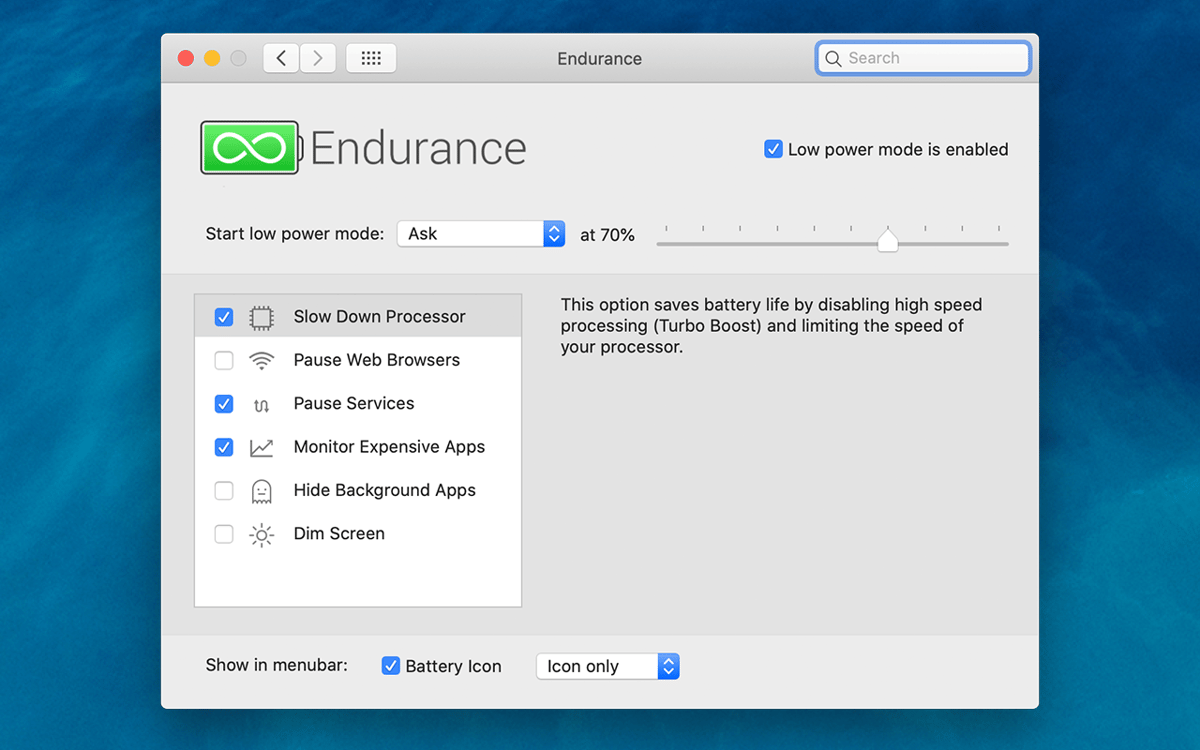Endurance es fácil de usar y de configurar para que tú lo puedas activar para aumentar al instante la autonomía de tu batería. Además, puedes modificar su configuración para obtener los resultados que quieres sin sufrir interrupciones en tu trabajo. Configura Endurance para que se active cuando la batería alcance un determinado porcentaje o para que nunca modifique el rendimiento turbo de tu Mac, ¡es todo decisión tuya!
