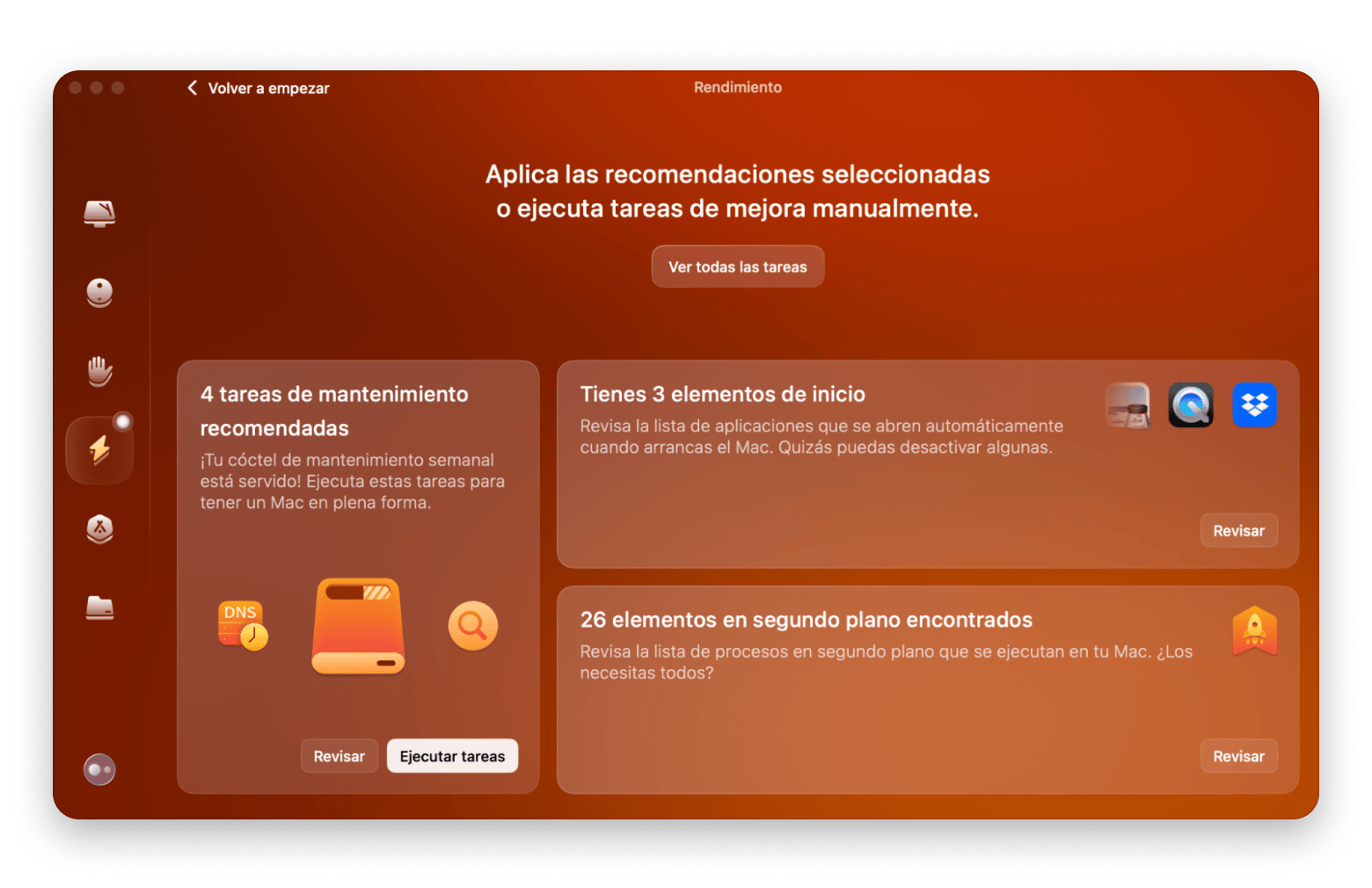 Ejecutar mantenimiento con CleanMyMac | Abre la app CleanMyMac > Ve a la sección Performance > Ejecuta las Maintanence Tasks Recommended > Reinicia tu Mac. |