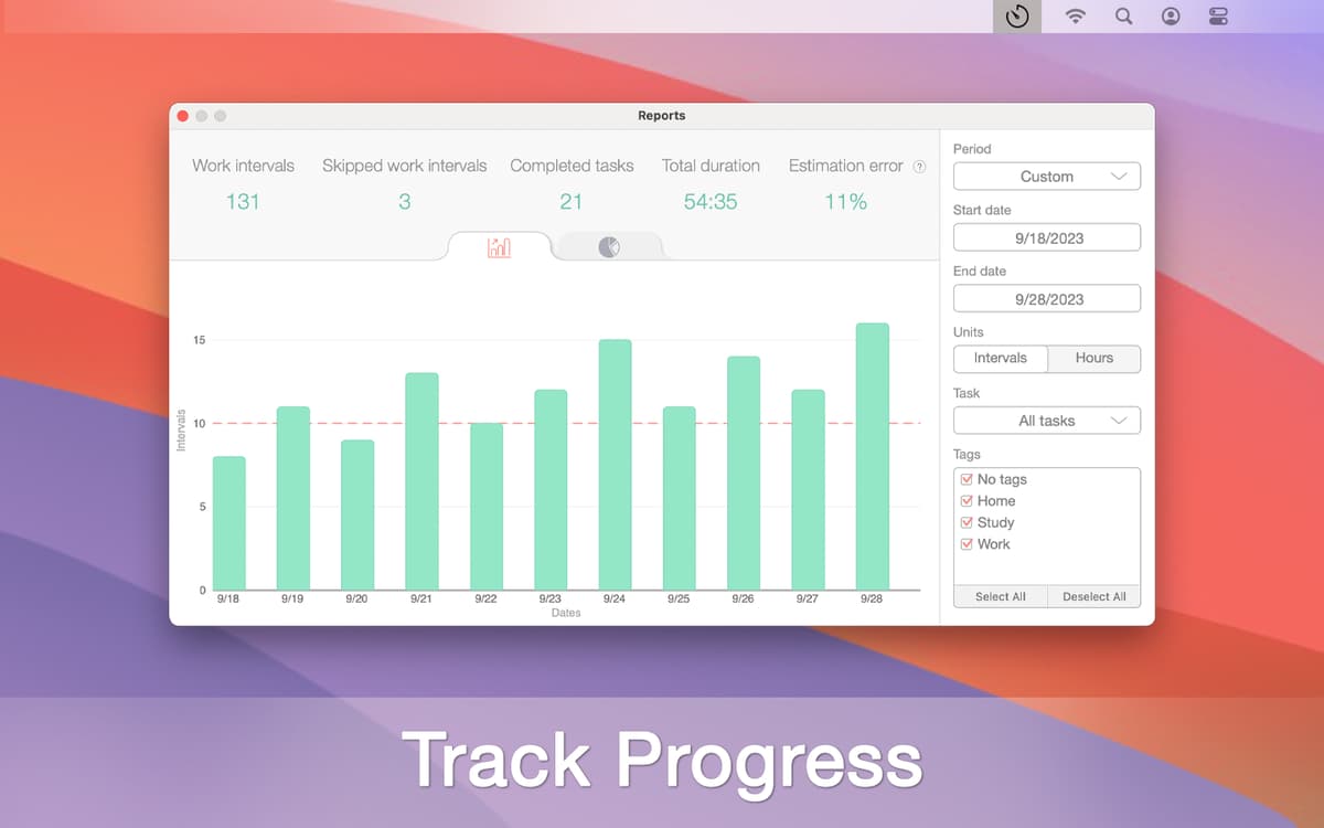 Pour organiser idéalement votre routine quotidienne, personnalisez cet outil de suivi des objectifs utile selon vos besoins. Réglez les intervalles et le nombre cible d’intervalles par jour. Habituez-vous à être productif et vous en ferez rapidement une habitude.