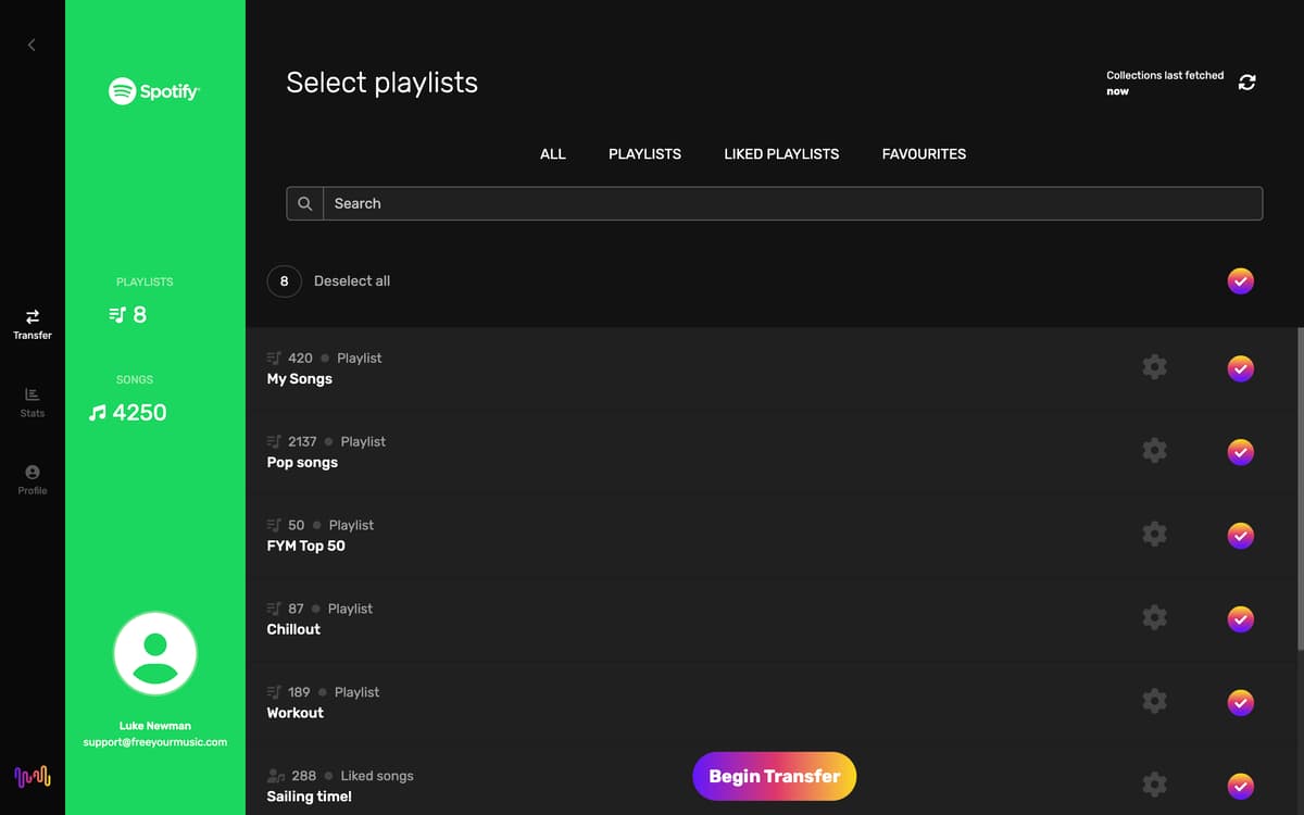Vous venez de passer de Spotify à Apple Music et vous ne voulez pas perdre les playlists que vous avez mis tellement de temps à créer ? Avec FreeYourMusic, quelques clics suffisent pour déplacer facilement des playlists et des titres entre Spotify, Tidal, Amazon Music et d'autres plates-formes populaires, et retrouver ainsi votre musique sur le service que vous souhaitez.