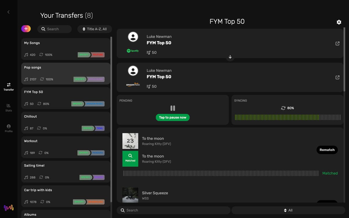 Quand vous changez de plate-forme, il peut être judicieux de faire du ménage dans votre bibliothèque musicale et de mieux la structurer. FreeYourMusic maintient l'organisation de vos playlists et vous permet de trouver facilement vos titres, albums et artistes préférés. Si vous constatez que des morceaux sont manquants ou incorrects, vous pouvez résoudre le problème d'un seul clic avec la fonctionnalité Rematch.
