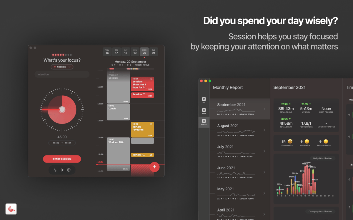 Session est une application de type pomodoro qui vous aide à optimiser votre productivité. Bloquez les distractions, travaillez par intervalles courts, et prenez des pauses régulières pour recharger vos méninges. Ce qui démarque Session du reste est son gros accent mis sur l'analyse. Cette application vous encourage non seulement à accomplir vos tâches, mais vous donne aussi des analyses sur votre travail et suit votre progression au fil du temps.