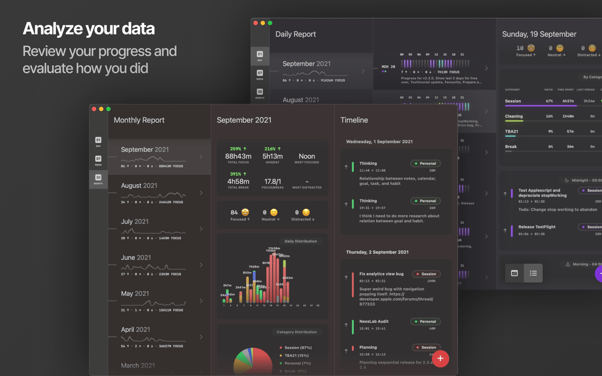 L'application offre un journal des sessions où vous pouvez suivre votre progression sur un certain nombre de jours ou de semaines. Découvrez vos moments les plus productifs, identifiez les motifs récurrents et ajustez votre flux de travail en conséquence. Vous pouvez choisir entre deux modes, Calendrier et Chronologie, pour suivre les sessions de la manière qui fonctionne le mieux pour vous.