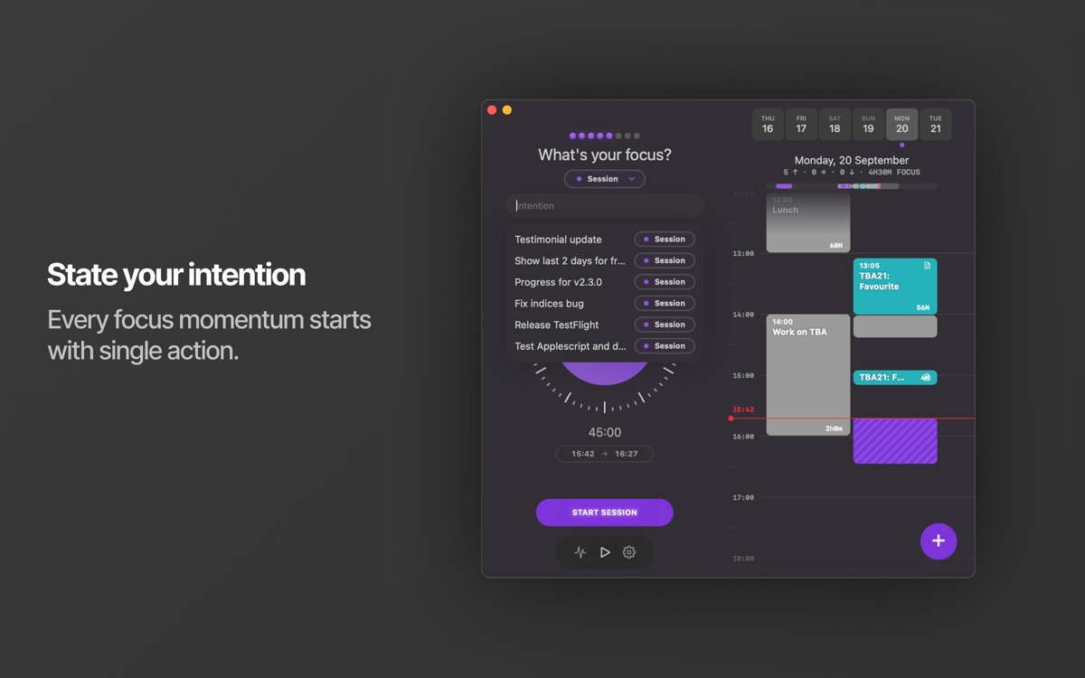 Session se synchronise à travers les appareils et est disponible avec un abonnement Setapp unique sur Mac, iPhone et iPad. Bloquez les distractions sur votre Mac, travaillez par intervalles définis sur votre iPad, vérifiez, analysez vos progrès sur votre iPhone, et synchronisez avec le Calendrier d'Apple. L'application s'adapte à votre planning de travail, de la façon que vous voulez.
