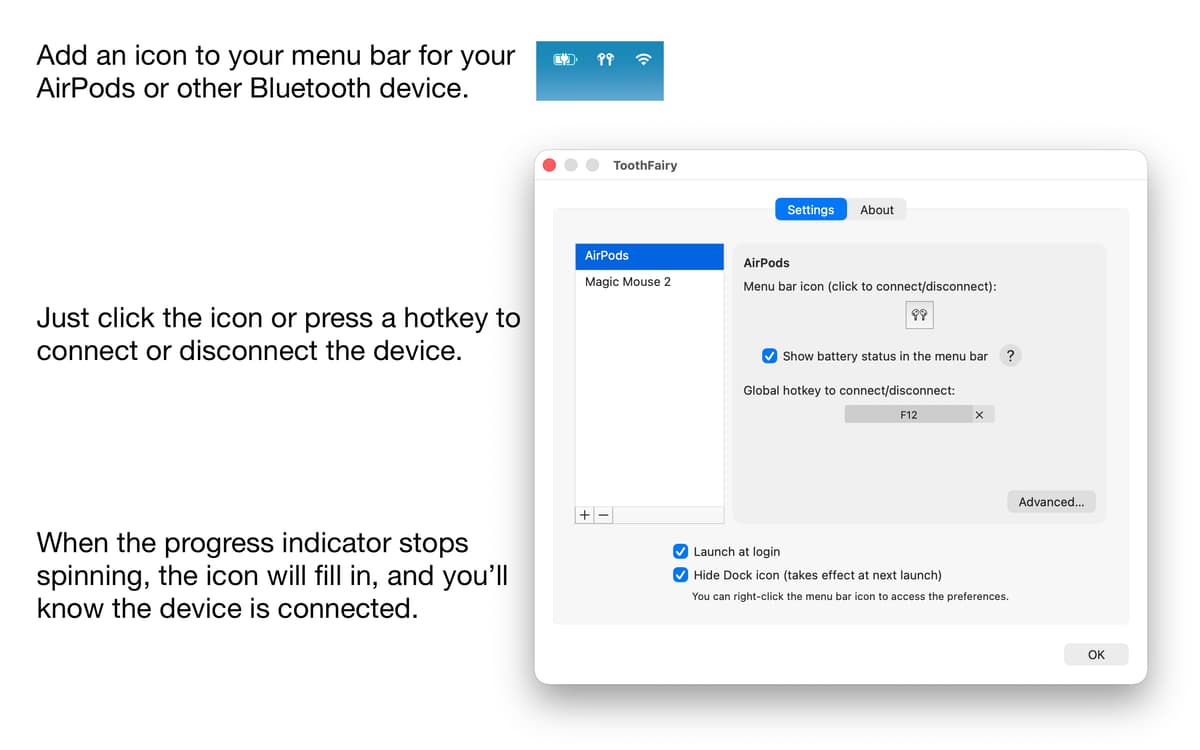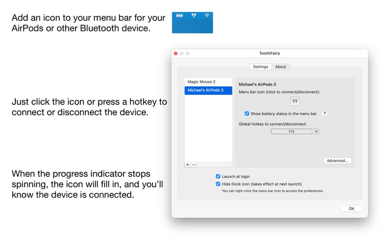 Apportez votre merveille à clic unique à quasiment tout appareil Bluetooth. ToothFairy fonctionne avec vos AirPod, écouteurs, haut-parleurs, casques, contrôleurs, claviers et souris. ToothFairy les ajoute à votre barre de menus de sorte que vous pouvez basculer entre chaque appareil avec facilité.