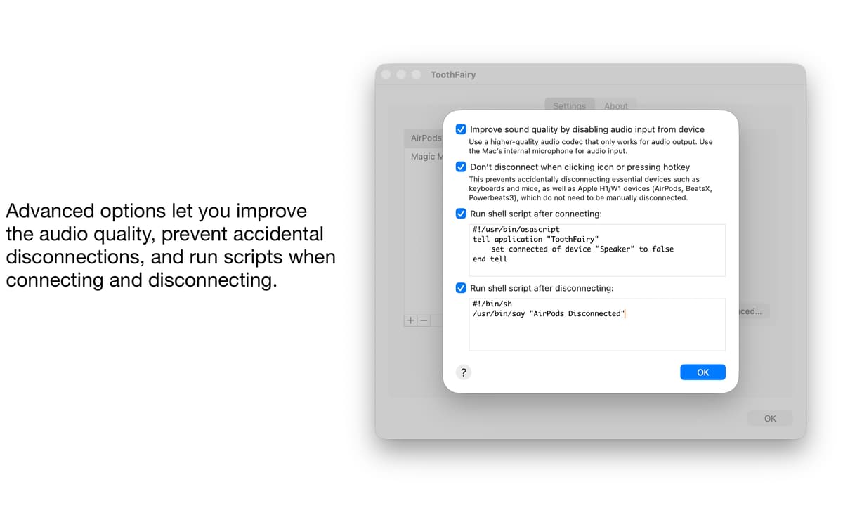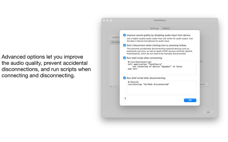 Tire davantage de vos périphériques Bluetooth. ToothFairy est livré avec des fonctionnalités avancées pour vous aider à personnaliser votre configuration. Évitez toute déconnexion accidentelle, améliorez la qualité audio ou exécutez des scripts shell personnalisés lorsque vous connectez ou déconnectez un périphérique. Par exemple, lancez votre application de musique préférée dès que le casque est connecté.