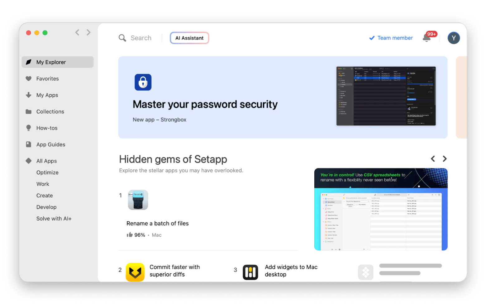 How Setapp works? Type what needs to be done or what kind of tool you need in search, or use an AI assistant for better results to fix Wi-Fi, locate hard-to-find files, take a scrolling screenshot, text expander, etc. Setapp will suggest an app for any job.