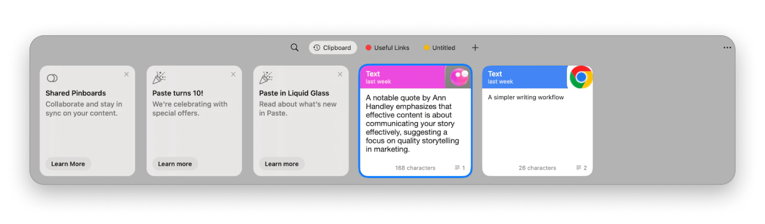 - Paste is another interesting example of a time- and stress-saving hack. The app essentially acts as an infinite clipboard, remembering everything you've copied in the last few days or weeks. You can set custom shortcuts and call upon Paste at any time within any app you're currently using (just press Shift + Command + V). It includes a built-in search function for quickly accessing any notes you've saved previously. Powerpack locks the clipboard history behind a paywall. Paste does it better — included in Setapp. Cancel before Day 7 — $0 charged. Start My 7-Day Trial.