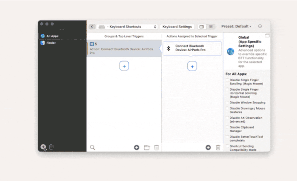 Not only can you create macros for use on Mac, but BetterTouchTool supports trackpad and mouse gestures, and allows for remote triggering of macros via iPad, iPhone, Apple TV remote, or Siri. One feature that AHK users particularly love is its ability to create hotkeys for specific apps, similar to the #IfWinActive directive in AHK. This makes it possible to set shortcuts without causing conflicts elsewhere. BTT also integrates with AppleScript and the Shortcuts app for more complex automations.