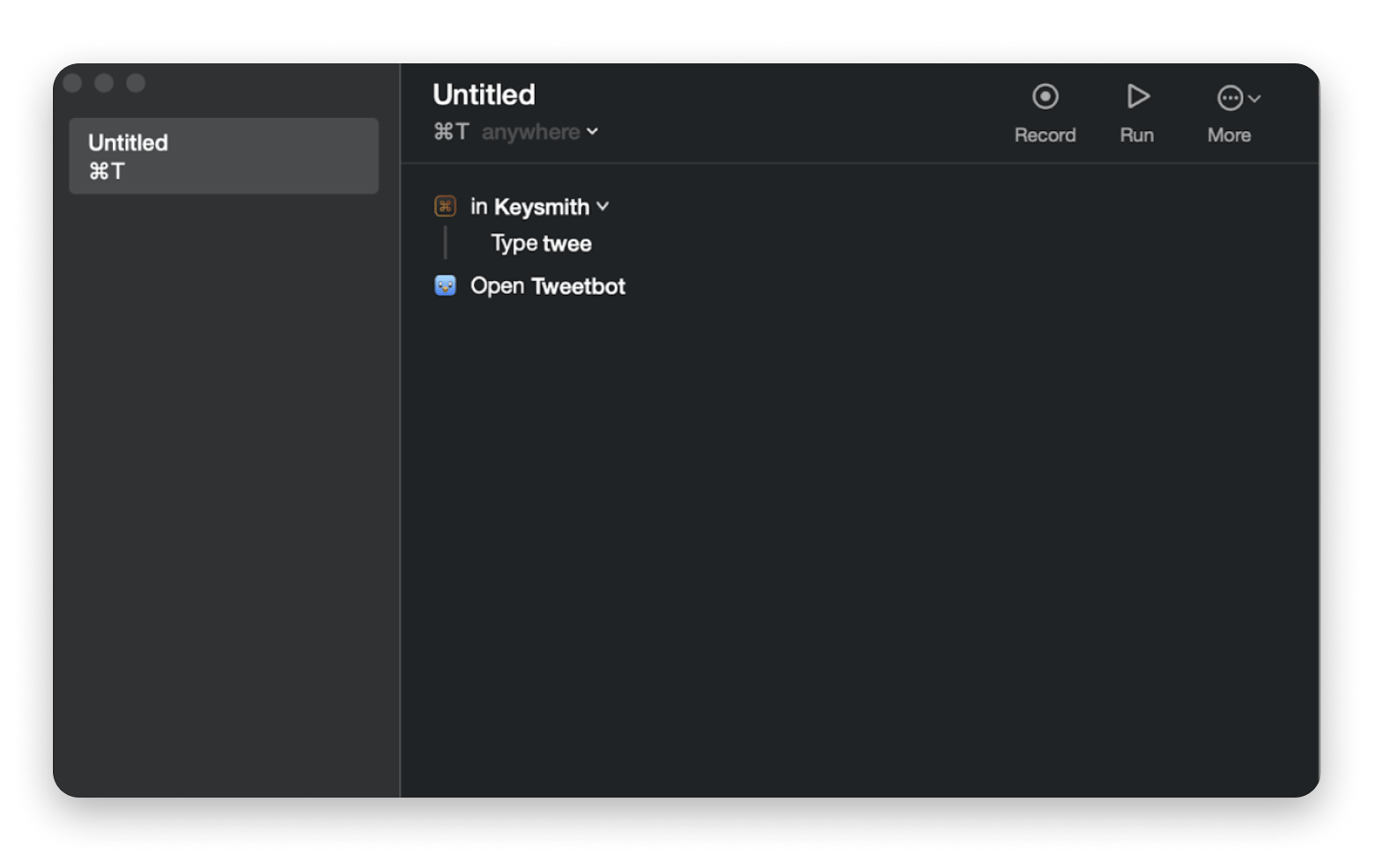 - Open an app with a hotkey — Open Keysmith, hit Record, launch your app, stop recording, and assign a keyboard shortcut. No scripting required.