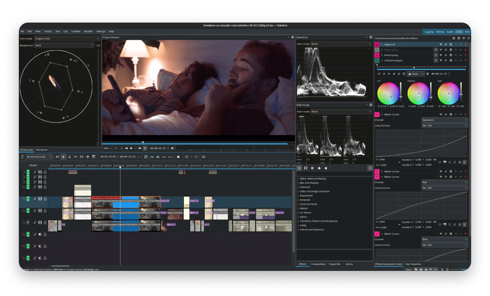 Kdenlive | macOS, Windows, Linux | Free users who still want advanced tools | Custom UI, proxy editing, color correction, tons of pro-level features | Free and open source |