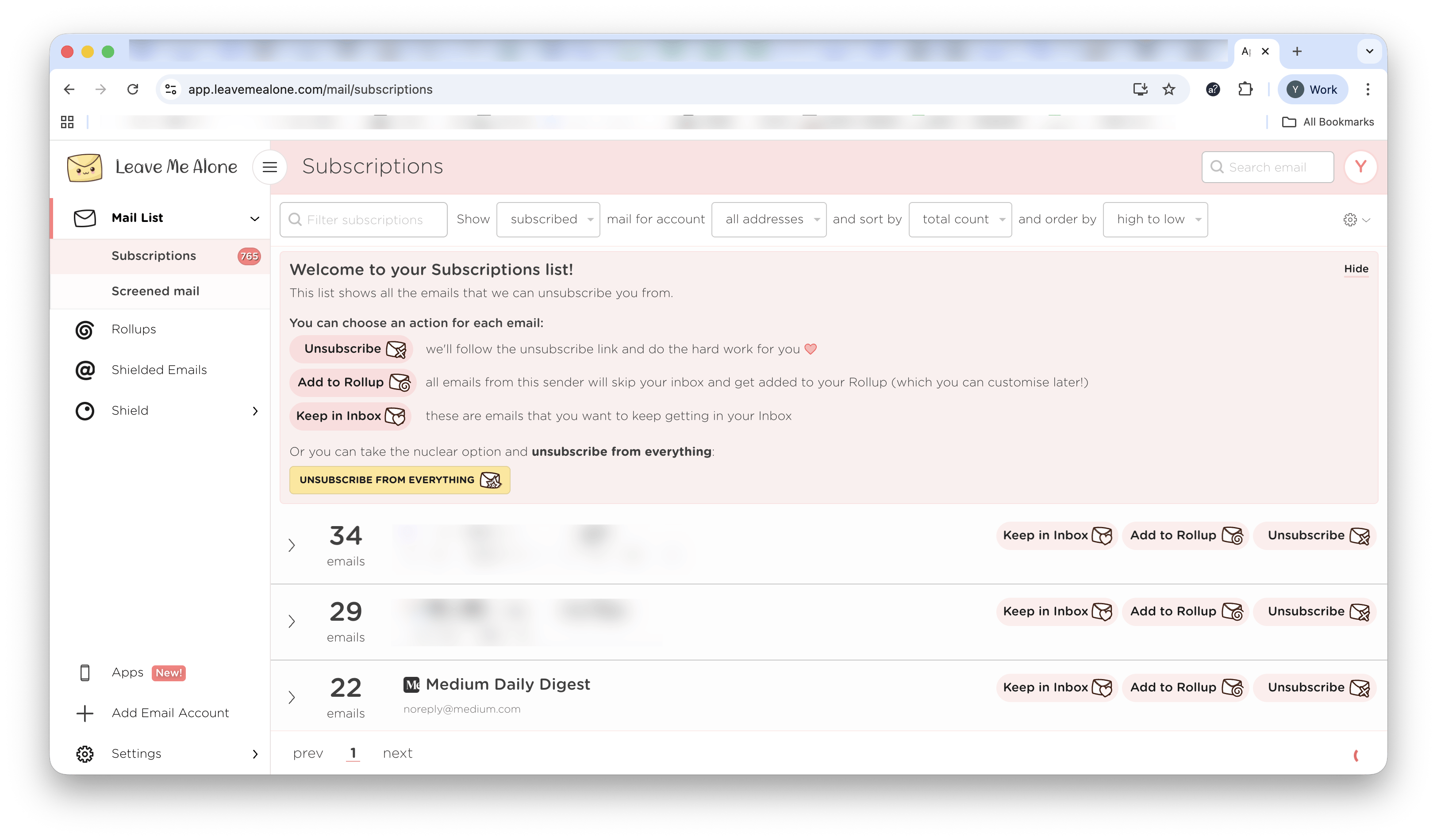 If your inbox is overflowing, it might be time for a little cleanup. A tool like Leave Me Alone can help you quickly review all the newsletters you’re subscribed to and decide which ones still deserve a place in your inbox. You can unsubscribe with a single click or group several newsletters into a Rollup and receive them as one digest on a schedule that works for you.