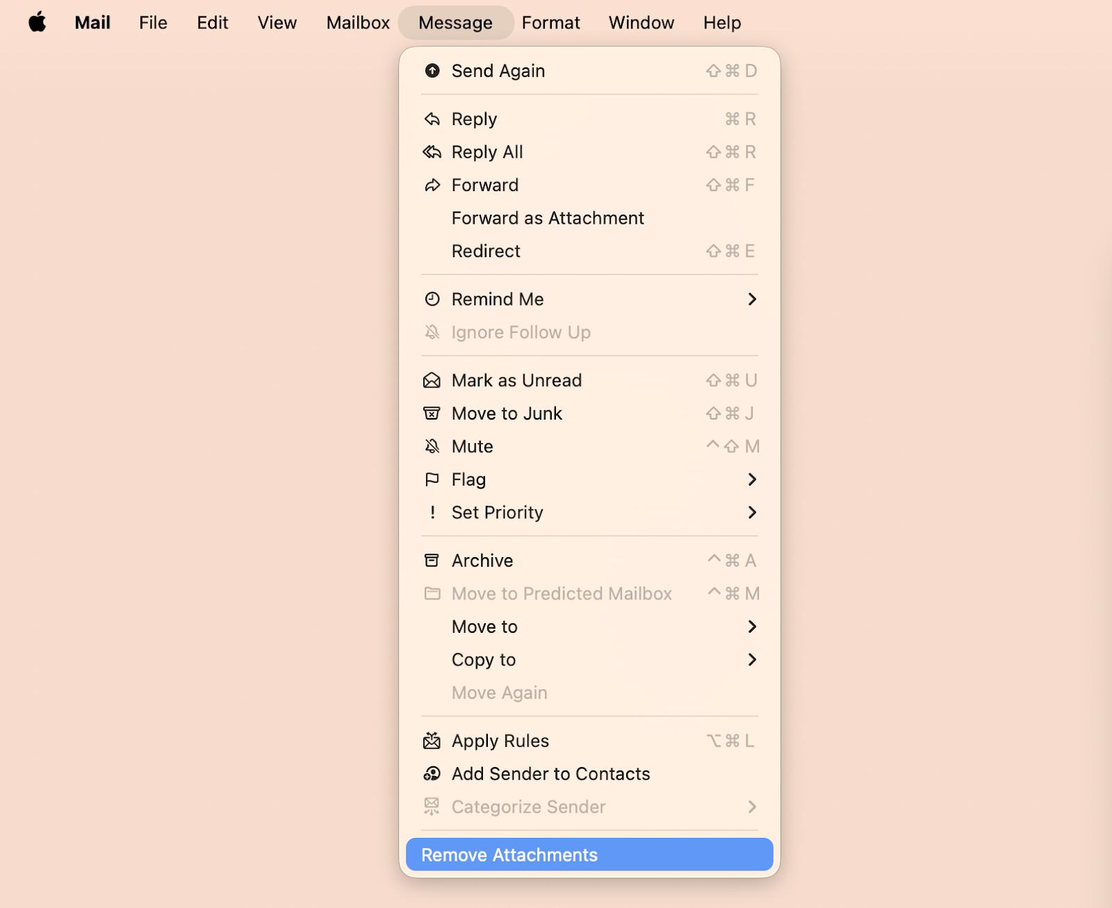 In the Mail app, select a message and go to Message > Remove Attachments to free up space while keeping the message intact. - Manually clear Mail downloads via Finder.