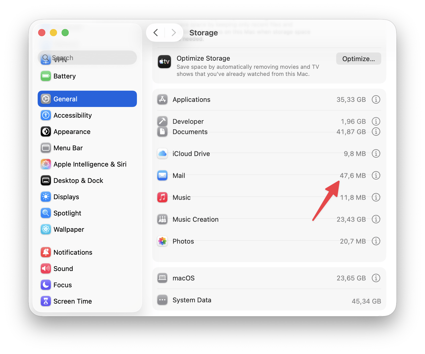Mail storage includes attachments, cached files, messages, and system data. Use Apple menu > System Settings > General > Storage to see how much space Mail occupies. - Delete attachments from individual emails.