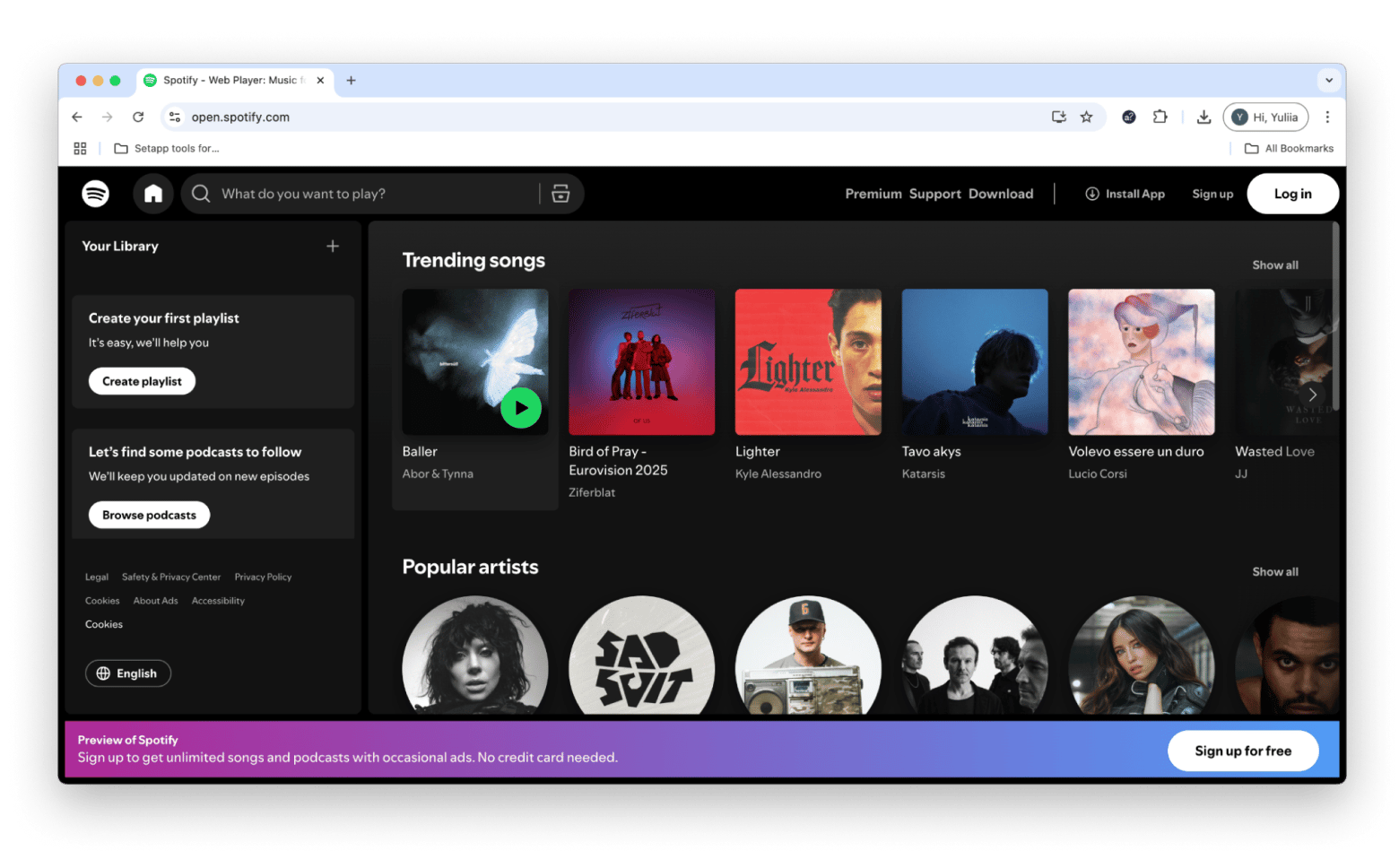 Just head over to Spotify Web Player on Mac, and you’re good to go. The web player works smoothly on all major, up-to-date browsers — including Safari 17, Google Chrome, Firefox, and Microsoft Edge — so you can start listening right away.