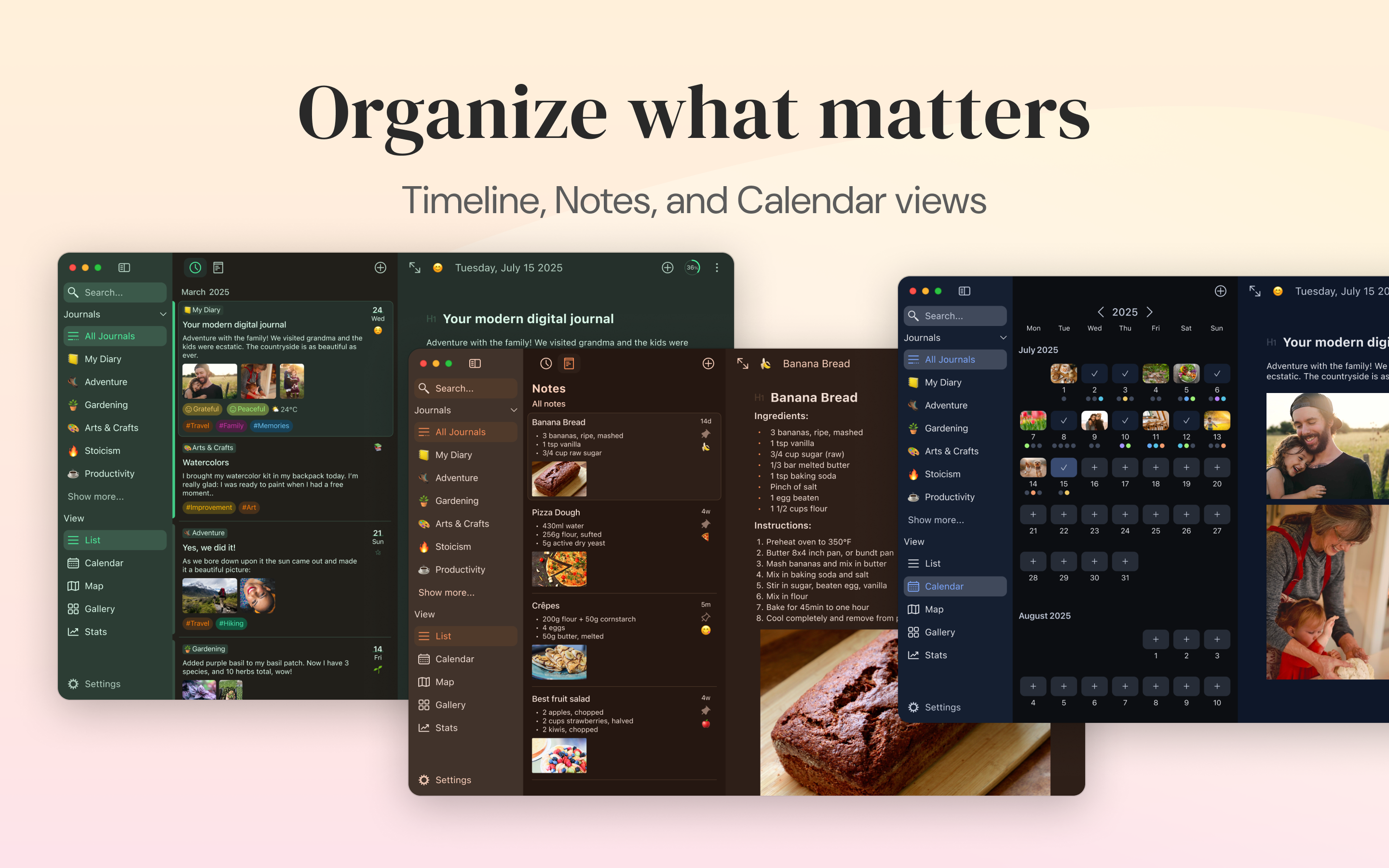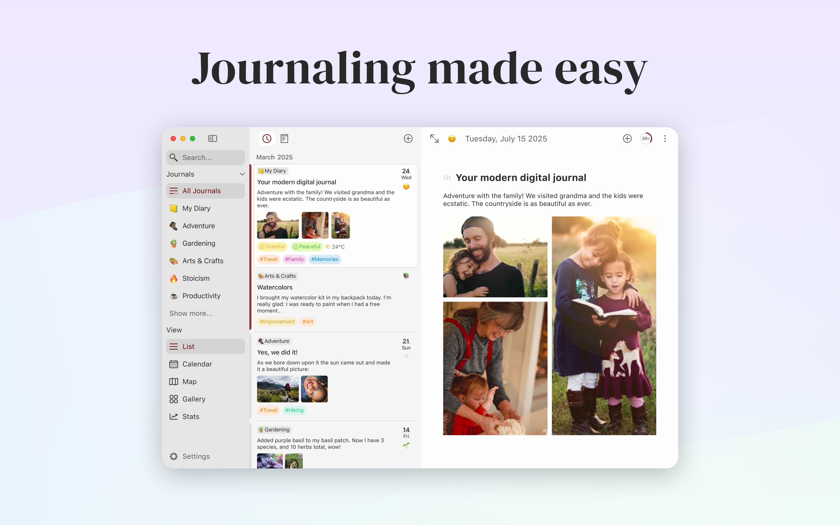 Diarly’s interface is all about distraction-free writing. And with lots of room for customization, you can make it even more convenient. Change fonts, themes, and sizes to give your diary a perfect look. If you want, you can have different templates for specific entry categories.