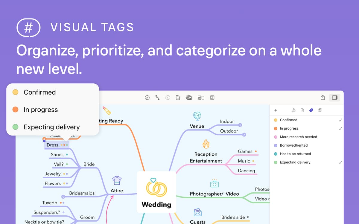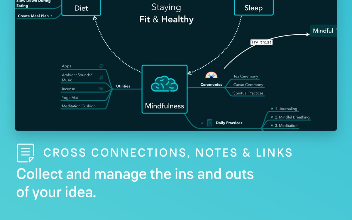Use words, images, stickers, tags, tasks, notes, and more to visualize your idea. Switch between outlining and mind mapping, or use them side-by-side to find the approach that works for you. MindNode, a robust mind mapping app, has the right tools to help you extract your ideas.