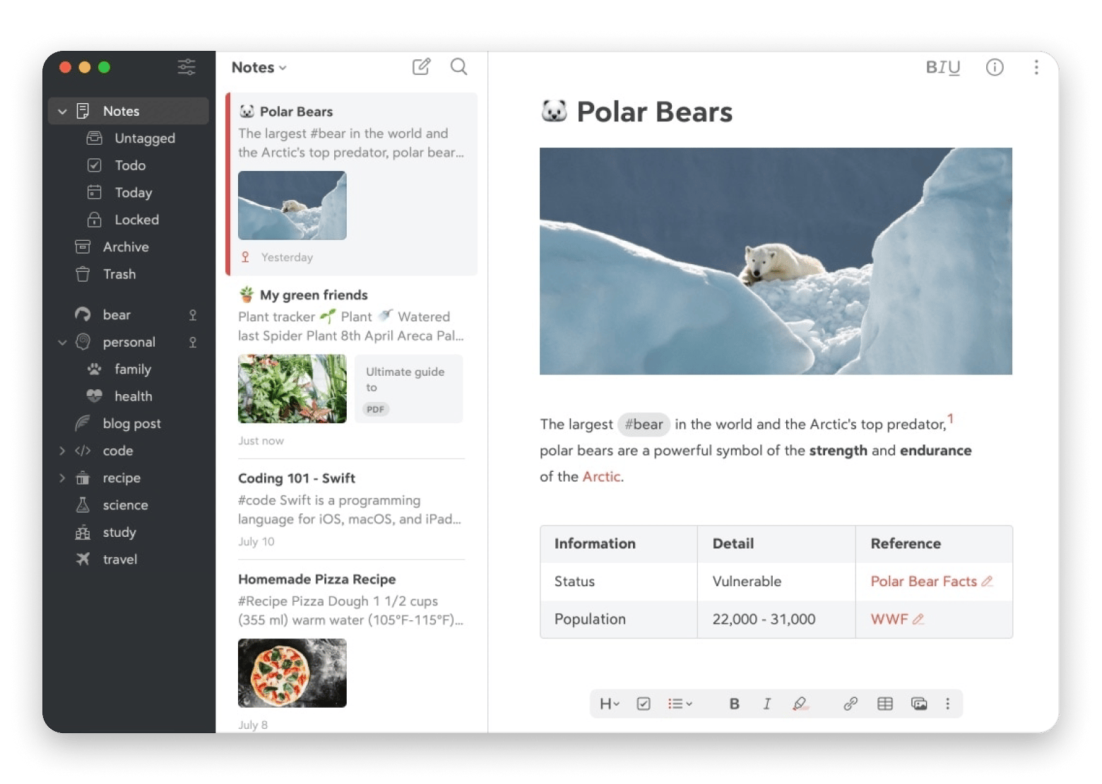 Bear is a OneNote alternative for Mac that’s loved by bloggers, writers, and anyone who enjoys a clean, clutter-free space to write. It’s easy to format with full Markdown support, and you can keep notes organized with tags and nested tags. It even supports sketching and drawing directly inside notes.