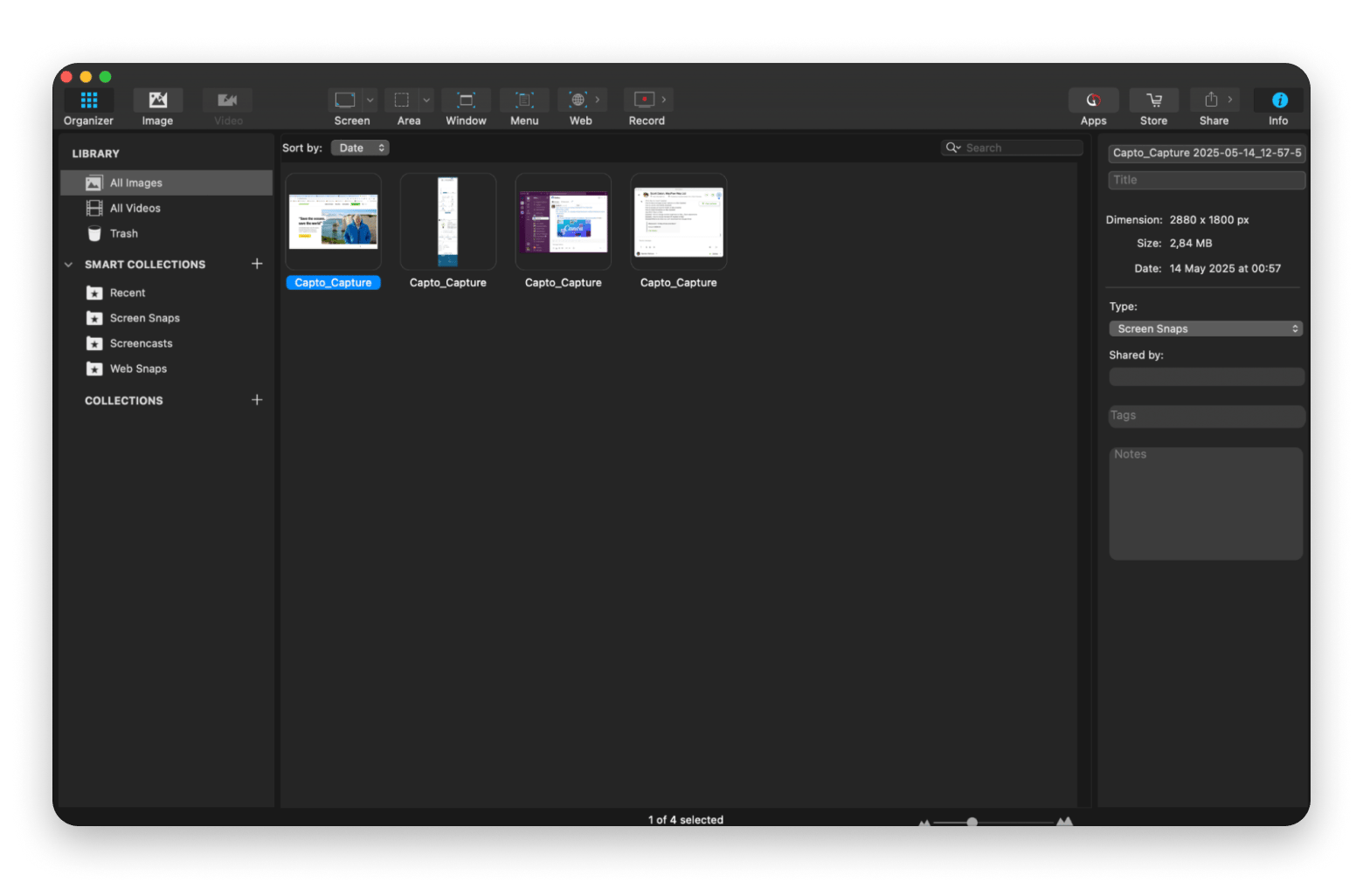 Capto is a video editor that also offers smart photo organization. It automatically sorts uploads into collections like web snaps or screencasts. You can create custom collections, search by keywords or date, and add metadata and comments.