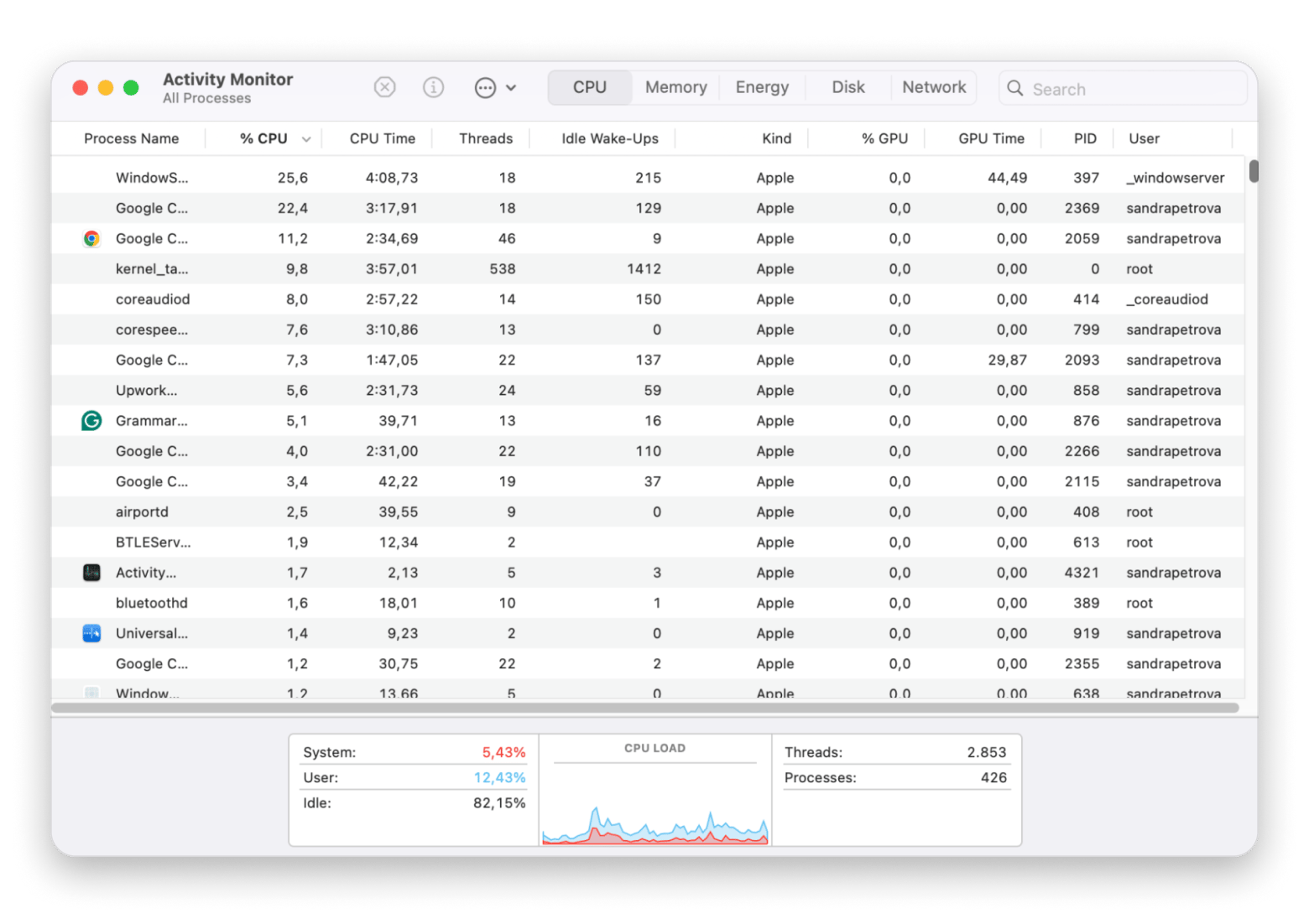- System: Percentage of CPU capability being used by processes that belong to macOS.