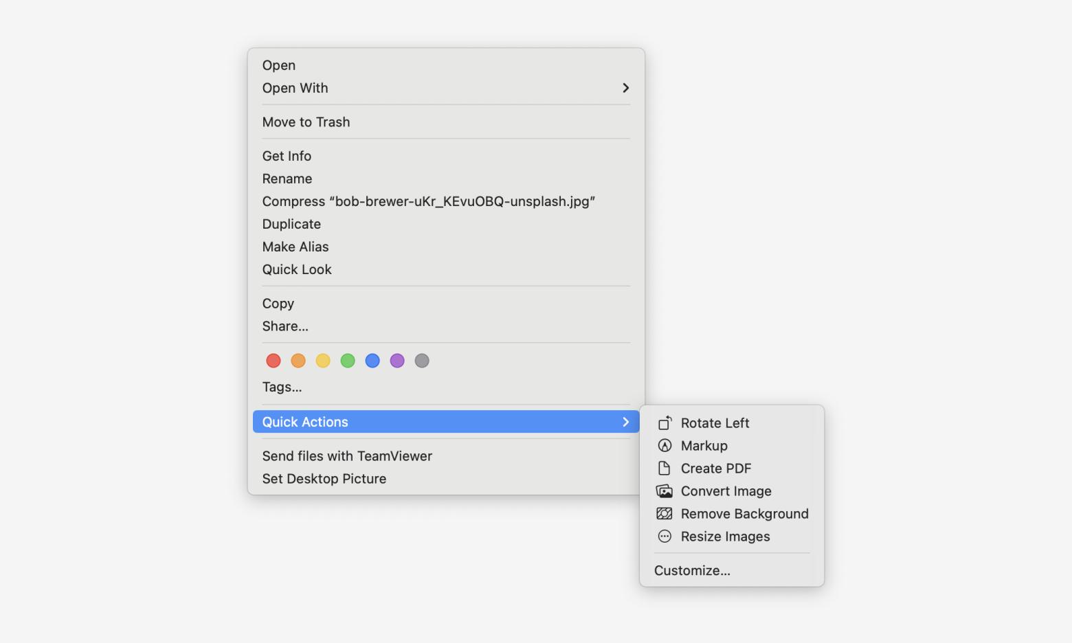 Now, you can easily deploy that quick action by searching anywhere on your computer for an image, right-clicking it, and hovering over Quick Actions > Resize Images (or whatever you named your Quick Action) in step six.