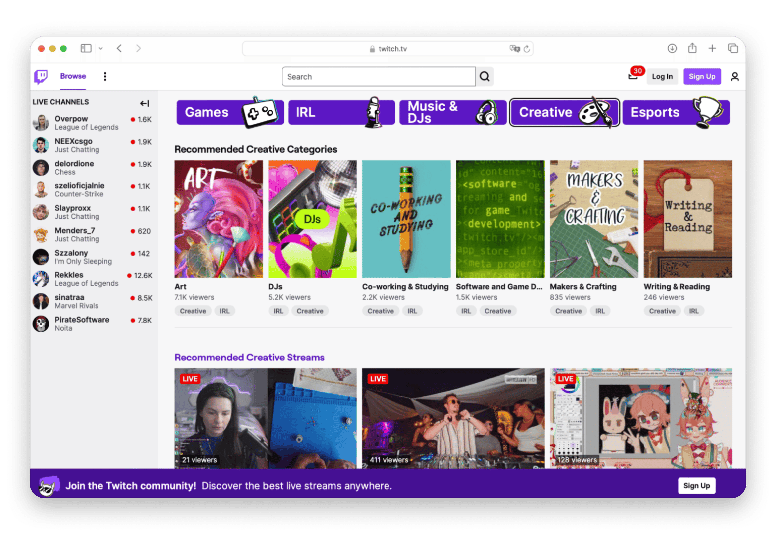 Twitch is a platform for live streaming favored by gamers and content creators. If you enjoy watching your favorite gamers play in real time, this place is for you. The best part? You can interact with them via chat. Beyond gaming, Twitch features content across a wide range of categories, such as music performances, cooking shows, art streams, and even casual chatting sessions with creators.