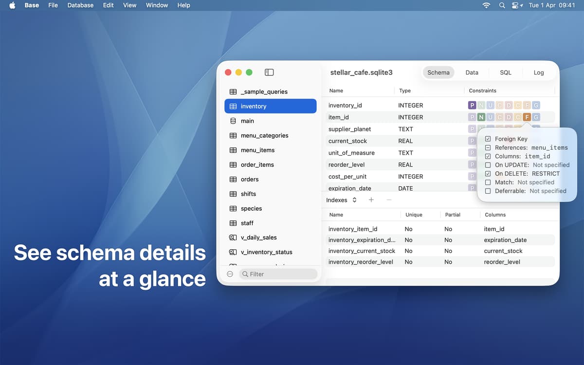 Base è un gestore di database SQLite che ti consente di creare, cercare e modificare rapidamente i dati in macOS, offrendoti un modo semplice ed efficace di tenere sotto controllo i database. L'app, con la sua interfaccia a foglio elettronico, risulterà familiare a tutti e per utilizzarla non occorrerà quindi imparare complicati comandi SQL.