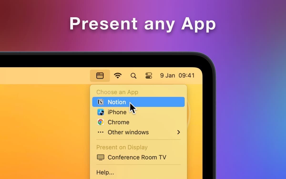 Scopri quant'è facile utilizzare CleanPresenter. Attiva la connessione tramite cavo o AirPlay. Mentre selezioni la finestra giusta verrà mostrata solo l'immagine che hai scelto.