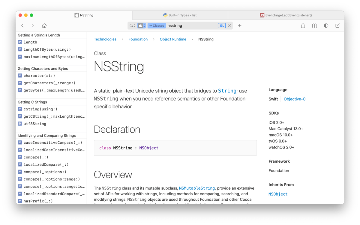 Dash è dotato di praticamente tutta la documentazione di cui potrai avere bisogno, compresa quella di macOS, Android, Angular, .NET Framework e più di 200 altre app. Scarica tutta la documentazione con cui lavori per potervi accedere facilmente anche quando sei offline. Dash si assicurerà che la documentazione sia sempre aggiornata.