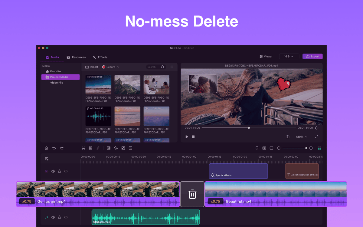 Quando modifichi un video con più tracce, l'eliminazione di sezioni nel video può essere difficile. In effetti, una volta eliminata la parte indesiderata, dovrai spostare manualmente l'audio e le altre sovrapposizioni nelle nuove posizioni. Con Filmage Editor, in base alle tue esigenze di editing, puoi scegliere di eliminare nel solito modo o con adattamento (con l'unione automatica dei clip restanti) senza preoccuparti del disordine!