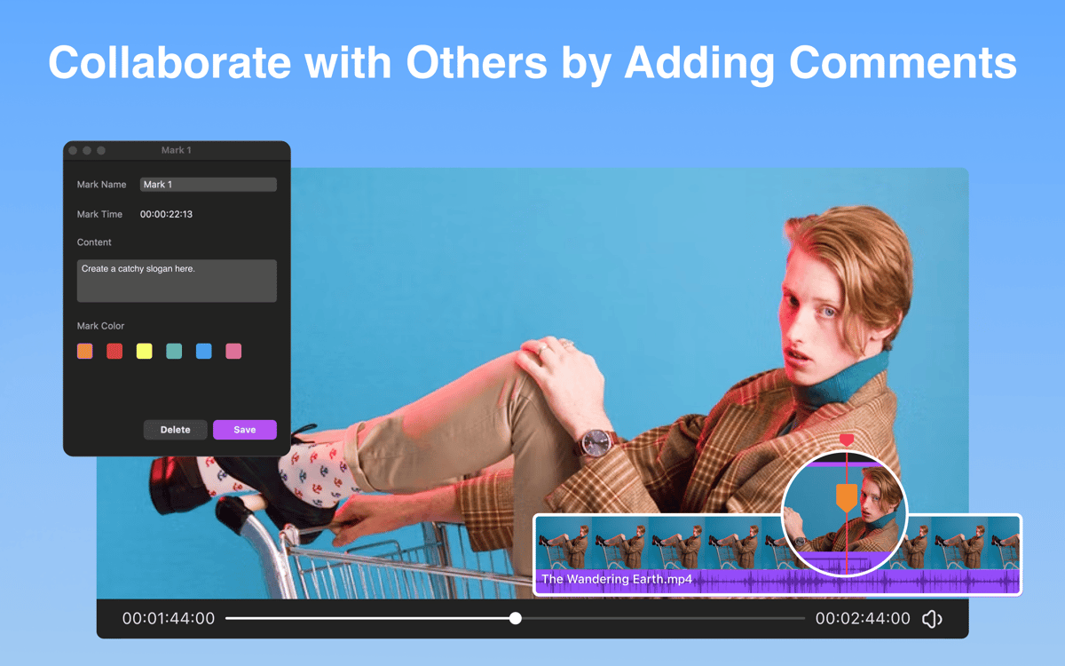 Se stai lavorando a un progetto che dura diversi mesi, se hai molti video o se stai collaborando con un team, questa funzione è fondamentale. Aggiungi note e commenti alle tue modifiche grazie agli indicatori delle sequenze temporali in Filmage Editor.