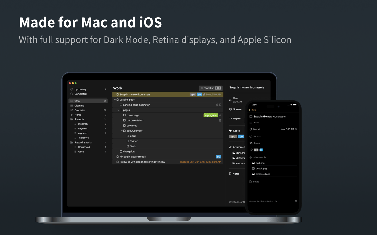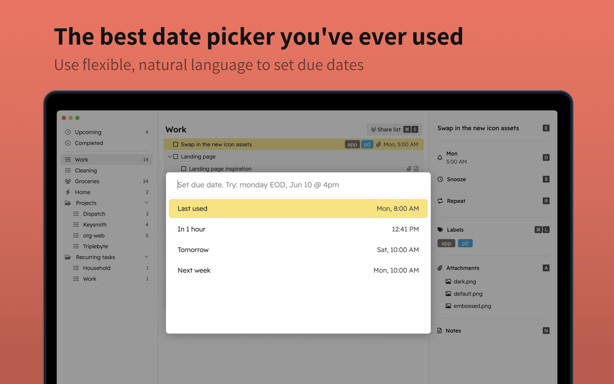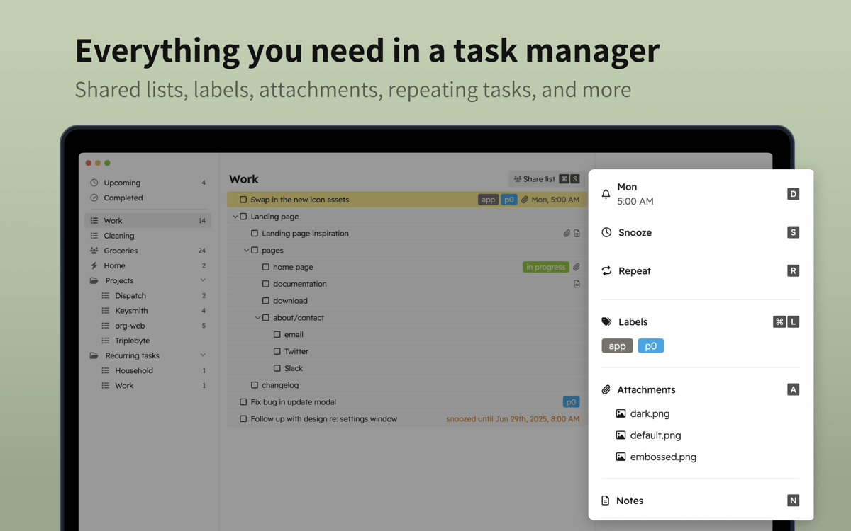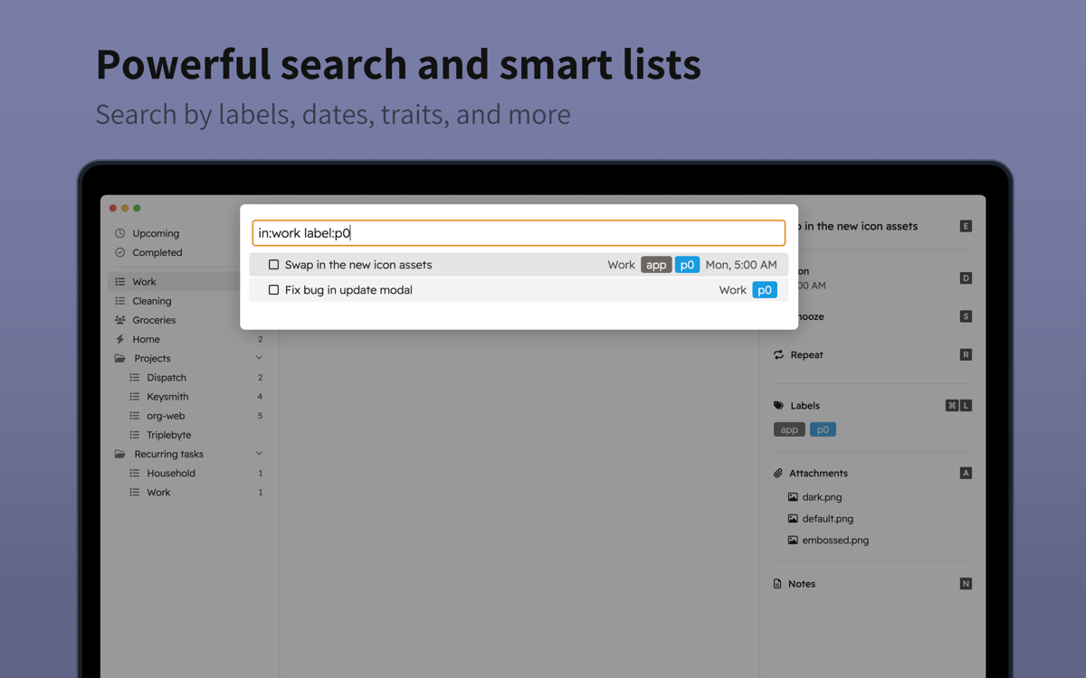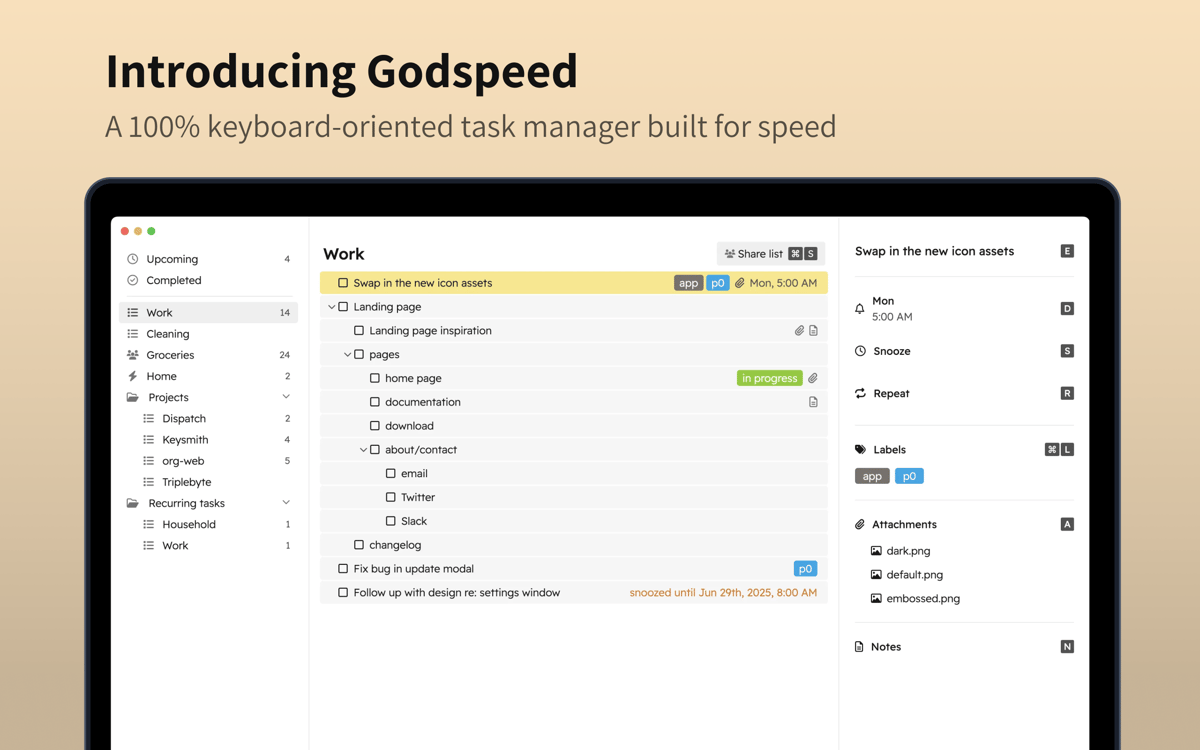 Godspeed sa che la gestione delle attività è tanto efficace quanto la velocità dello strumento che si utilizza allo scopo. Risparmia tempo quando aggiungi o modifichi le tue attività con l'input da tastiera dell'app: aggiungi e modifica la maggior parte delle cose da fare mediante la tastiera e le scorciatoie per le azioni rapide. Usa la scorciatoia Comando-K per accedere a tutti i tasti di scelta rapida in una libreria attraverso la palette dei comandi dell'app.
