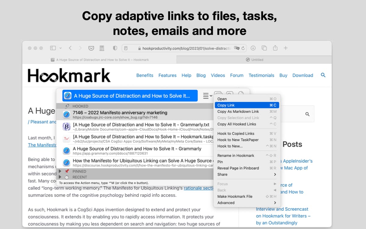 Quando apri Hookmark con un'abbreviazione da tastiera Control + H o facendo clic sull'icona di Hookmark nella barra dei menu, l'app riconosce il contesto e ti consente di collegare ciò che hai selezionato nella finestra in primo piano.