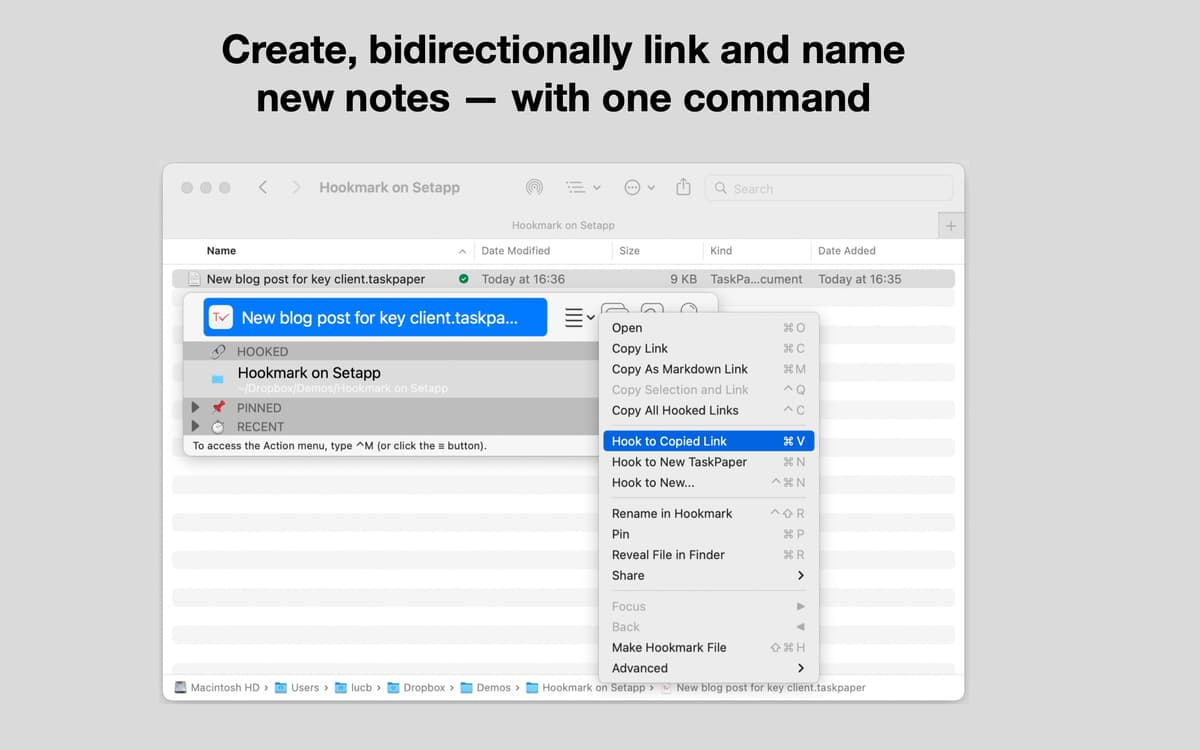 Quando selezioni un elemento e apri Hookmark, puoi scegliere di copiare il relativo collegamento. Anche se sposti il file che hai collegato con Hookmark, l'app sa dove trovarlo e ti ci porta quando ne hai bisogno. Dopo aver creato il collegamento, puoi salvarlo, aggiungerlo alle note o collegarlo a qualcos'altro (collegamento bidirezionale).