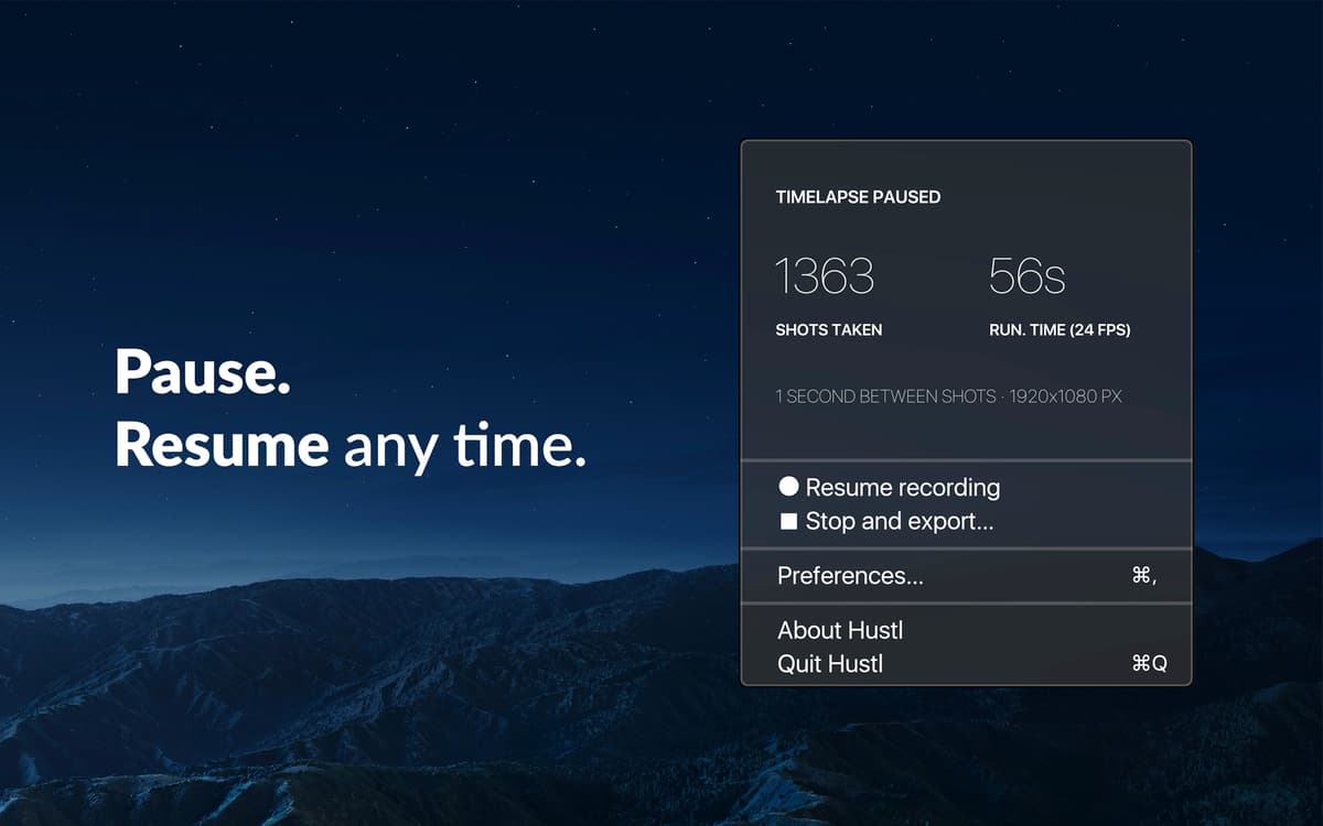 Hai bisogno di una pausa? Metti in pausa il tuo time-lapse e riprendilo quando sei pronto. Mentre ti godi la pausa, Hustl ti mostrerà approfondimenti sulla registrazione recente, come il numero di scatti effettuati e la durata del tuo video time-lapse. Usa queste informazioni per controllare e regolare il tuo flusso.