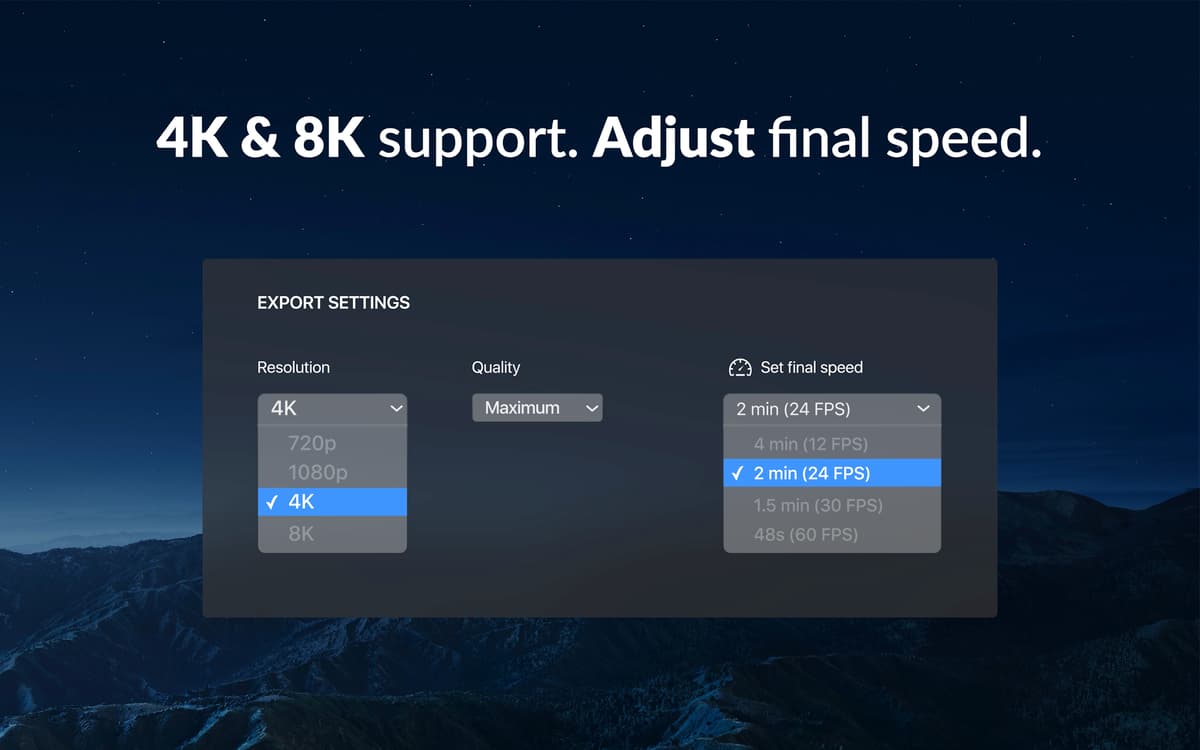 Risoluzione 4K e 8K: ecco la qualità che può offrirti Hustl per i tuoi video time-lapse. Con il supporto per video ad alta risoluzione, puoi esportare i tuoi time-lapse con una qualità fino a 8K. Goditi ogni momento fugace, al massimo della nitidezza.