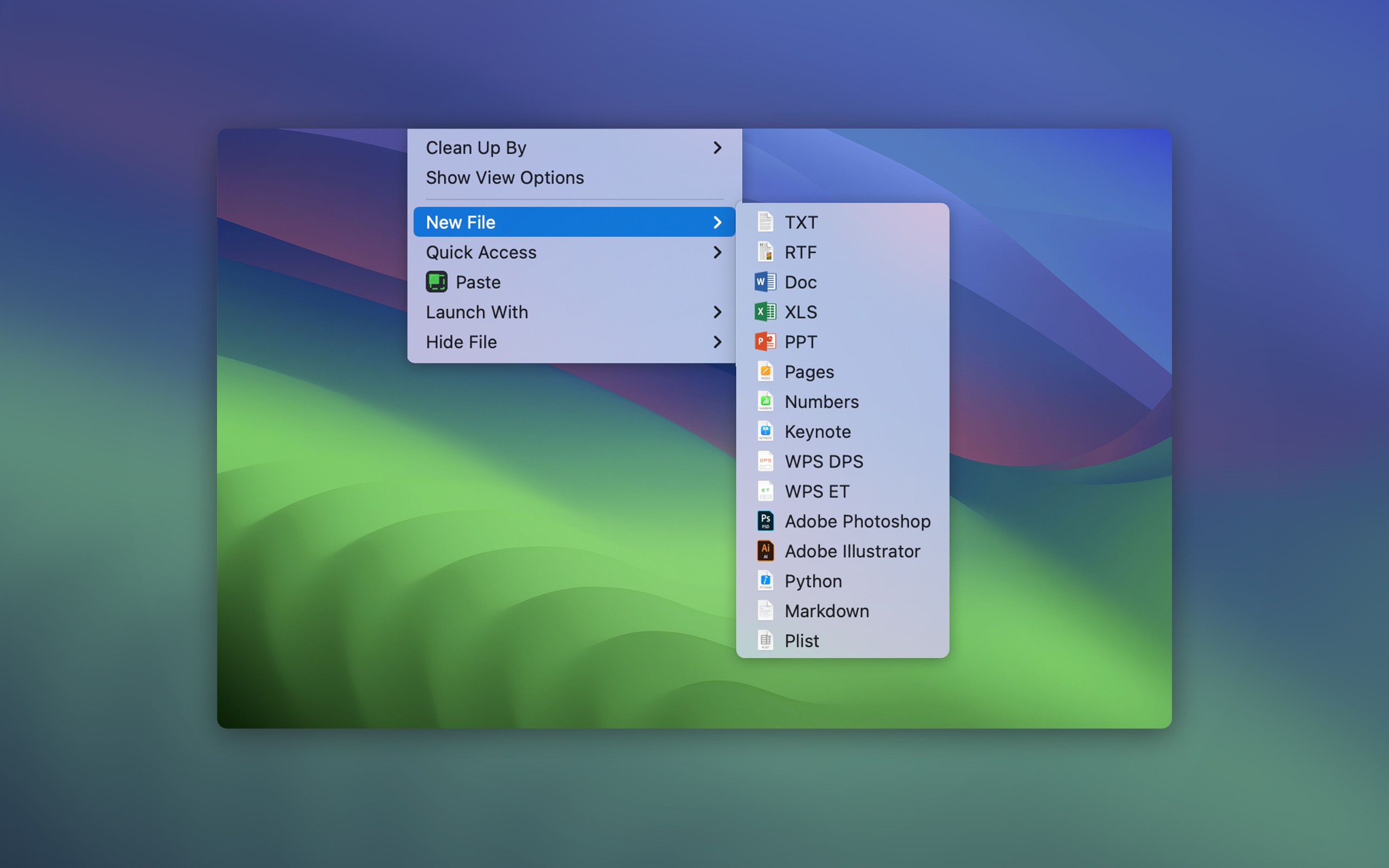 Vuoi creare un nuovo file? Ti basta fare clic su qualsiasi spazio vuoto in una cartella o sulla scrivania del Mac e ottieni l'opzione corrispondente nel menu del clic destro. Aggiungi la relativa abbreviazione per consentire la creazione di nuovi file in un'ampia varietà di formati, compresi KEY, PDF, TXT, PAGES, DOCX, XLSX e altri ancora.