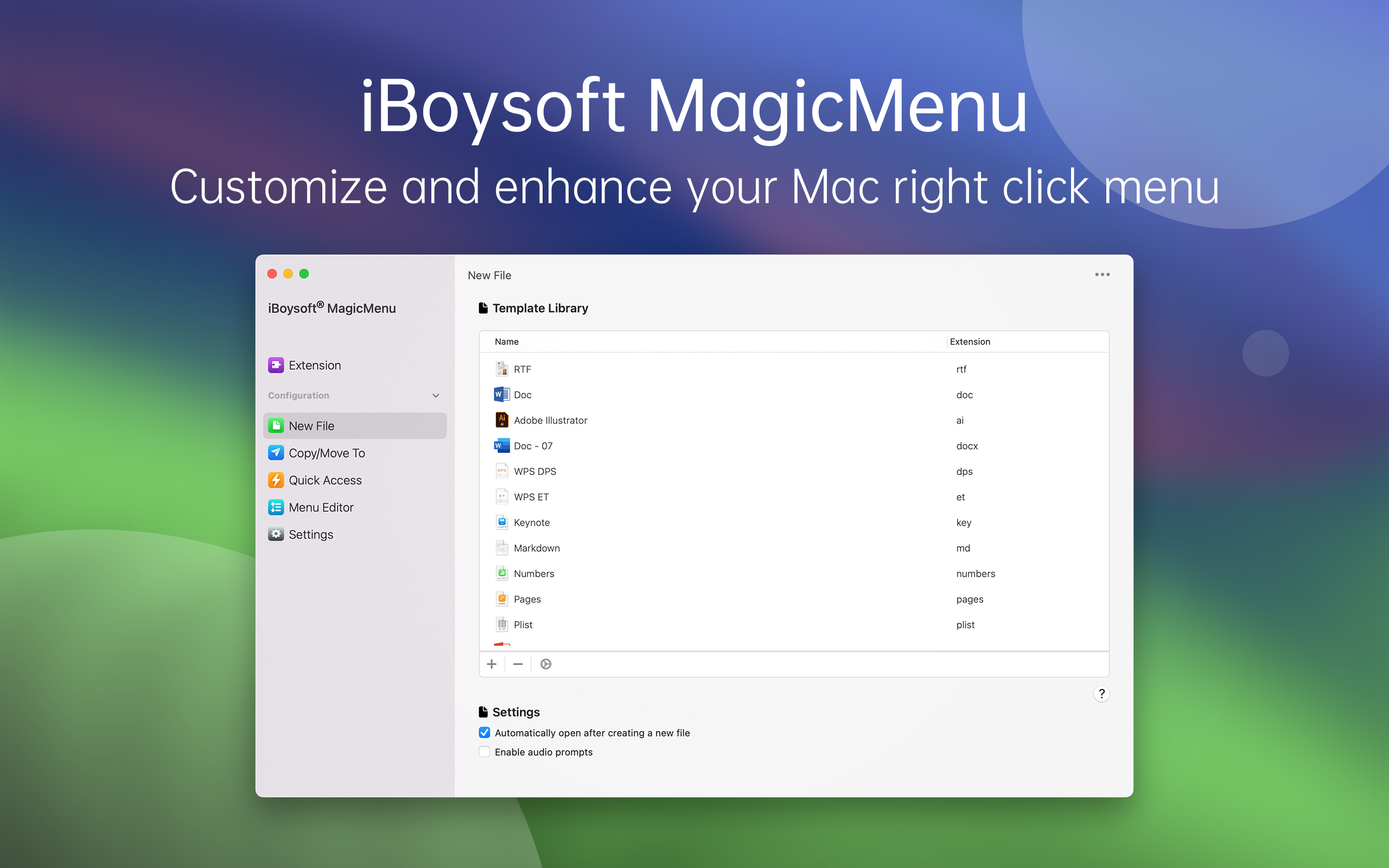 Non esiste uno strumento usato più frequentemente sul Mac del menu del clic destro. Tuttavia, non devi limitarti alle opzioni offerte dalla configurazione di default. Aggiungi altre funzionalità al menu del clic destro grazie all'app iBoysoft MagicMenu.
