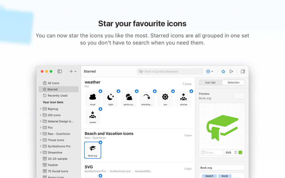 IconJar è dotata di un'opzione di anteprima accessibile tramite “Visualizzazione rapida”, così potrai verificare cosa contiene un'immagine senza bisogno di aprirla. Sfoglia le icone, cerca rapidamente tra le varie raccolte e trova quello che cerchi. Detto, fatto.